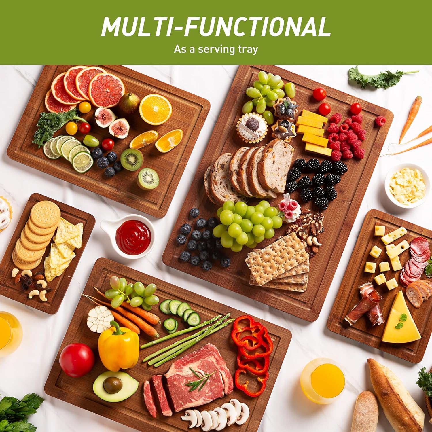 - Perfectly Sized for Versatile Use: Our bamboo cutting board set has five sizes β 9"x6", 11"x8.5", 14.5"x11", 17.5"x12" and 19.5"x14" . This set of 5 bamboo cutting boards are perfect for everyday food preparation, from slicing fruit to chopping veggies. Thoughtfully sized to fit different needs without taking up too much counter space. Whether dicing veggies, slicing fruits, or carving meats, there's a chopping board for every occasion. Perfect for various kitchen tasks and charcuterie boards.