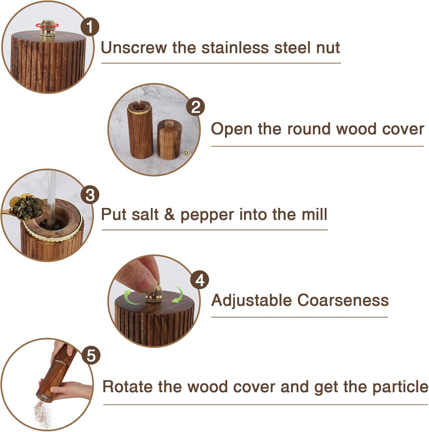 - Adjustable& Easy To Use: Each of our professional Pepper grinder,contains an efficient adjustable,It is easy to adjust by twisting the nut at the top of the grinder from loose to tight to get the desired spice fineness according to your needs, counter-clockwise for more coarse, clockwise for fine