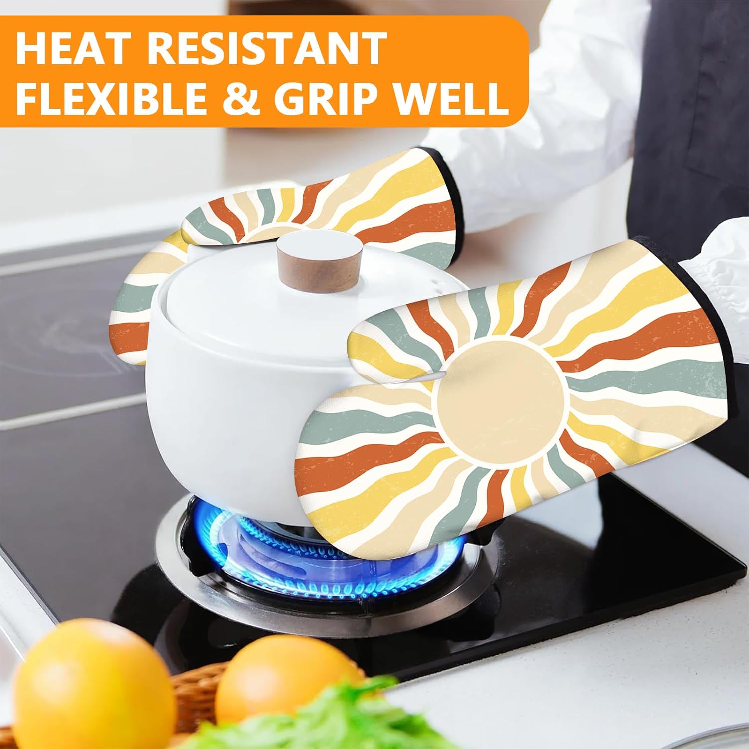 Boho Sun Oven Mitts and Pot Holders Sets 4Pcs,Extra Long Oven Gloves Potholder for Kitchen Cooking Baking BBQ 100% Cotton Heat Resistant