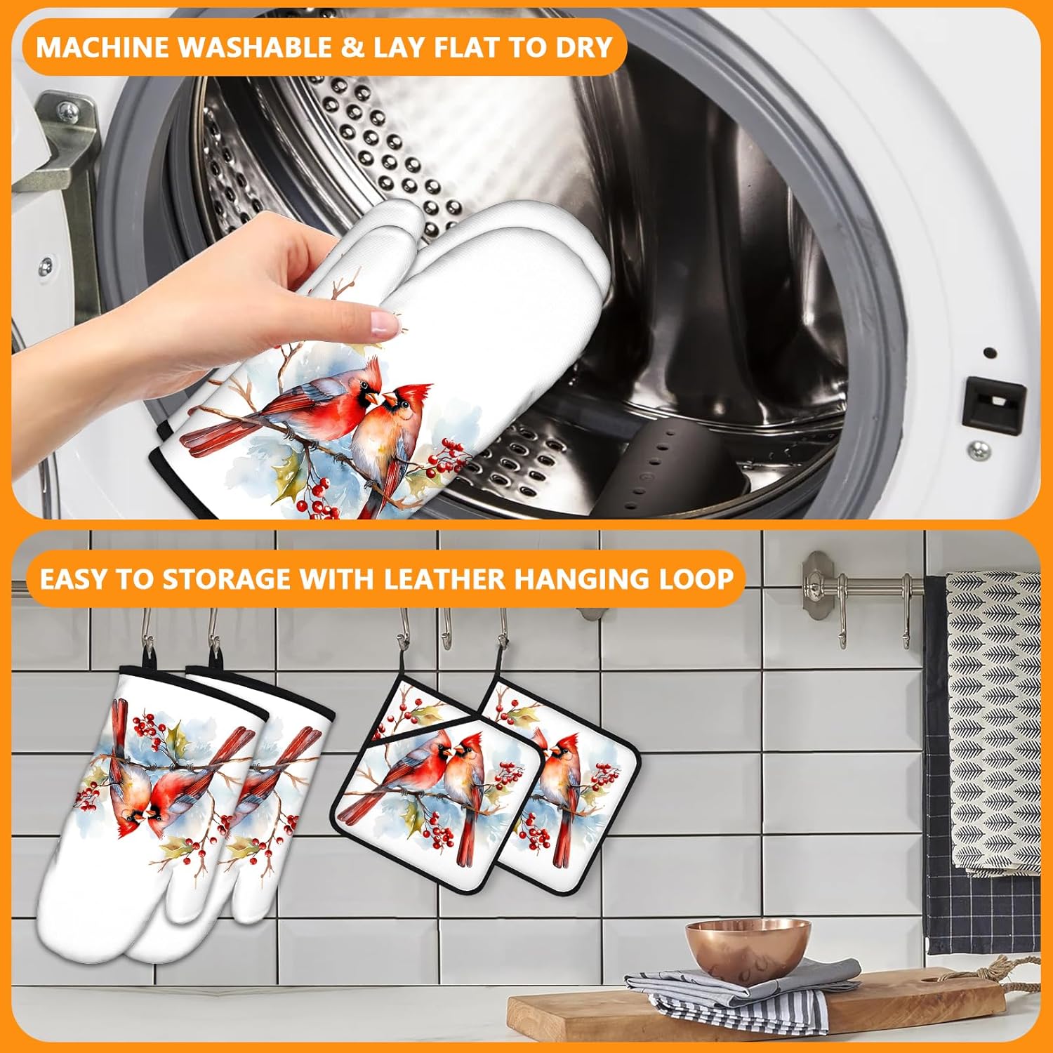 Red Cardinal Birds Oven Mitts and Pot Holders Sets 4Pcs,Extra Long Oven Gloves Potholder for Kitchen Cooking Baking BBQ 100% Cotton Heat Resistant
