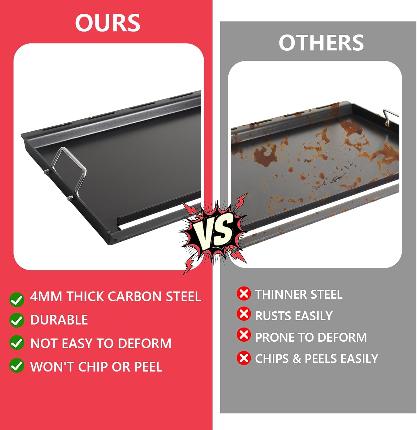 - Built to Last & Cook Like a Pro: Why settle for warped, uneven griddles? Crafted from premium 4mm carbon steel, this heavy-duty plate distributes heat evenly and handles high-heat searing, pancakes, or veggies without warping. Its rugged design resists rust and scratches, unlike thin competitors. Whether you're flipping burgers or stir-frying, this flat griddle top plate for weber genesis 2 griddle insert 400 series outperforms Cast iron with faster preheating