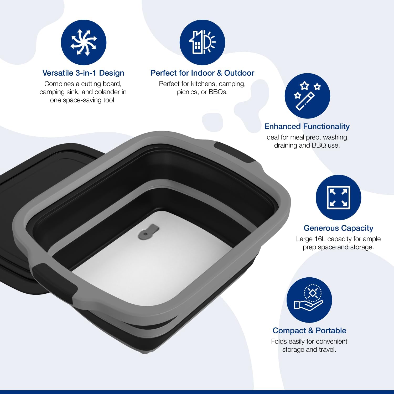 - BBQ Marinate, Drain & Prep – Made from food-safe materials, this tub lets you marinate meats mess-free, drain excess liquids with the built-in strainer, and prep food on the sturdy cutting board. The collapsible design saves space, and it's easy to carry for effortless grilling.