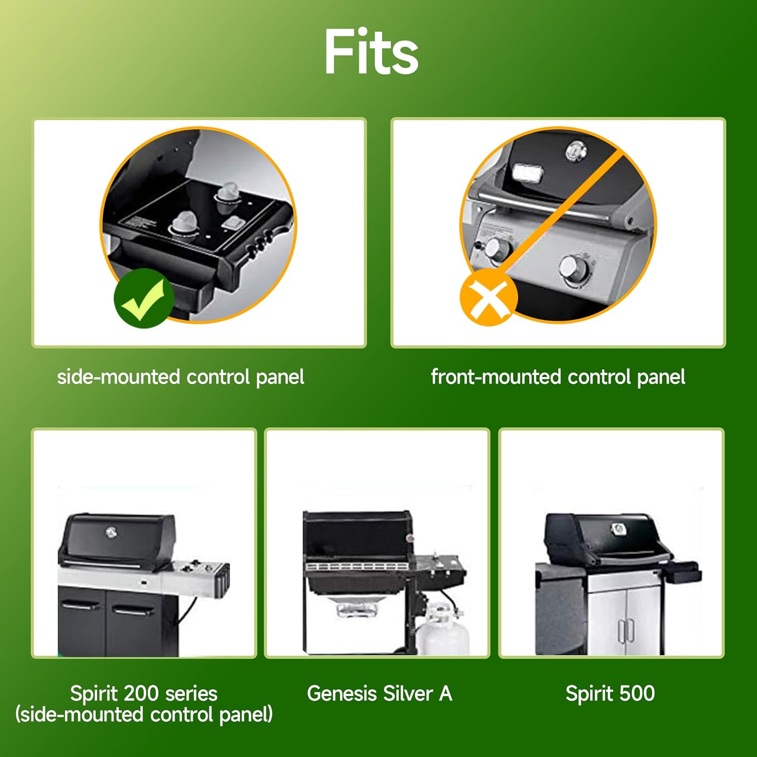 - FIT PERFECTLY: Fits Weber Spirit 200 Series (with Side-Mounted Control Panel): Spirit E 200 (2009-2012), Spirit E-210 (model years 2012 and older), Spirit S 200 (2009-2012), Spirit S 210 (2009-2012) Gas Grills.Fits for weber 6711411.DOES NOT fit front-mounted control panel models. Fits Weber Genesis Silver A, Spirit 500 Gas Grill. Compatible with Weber Part Number: 7522 7523 7521 65904 65905