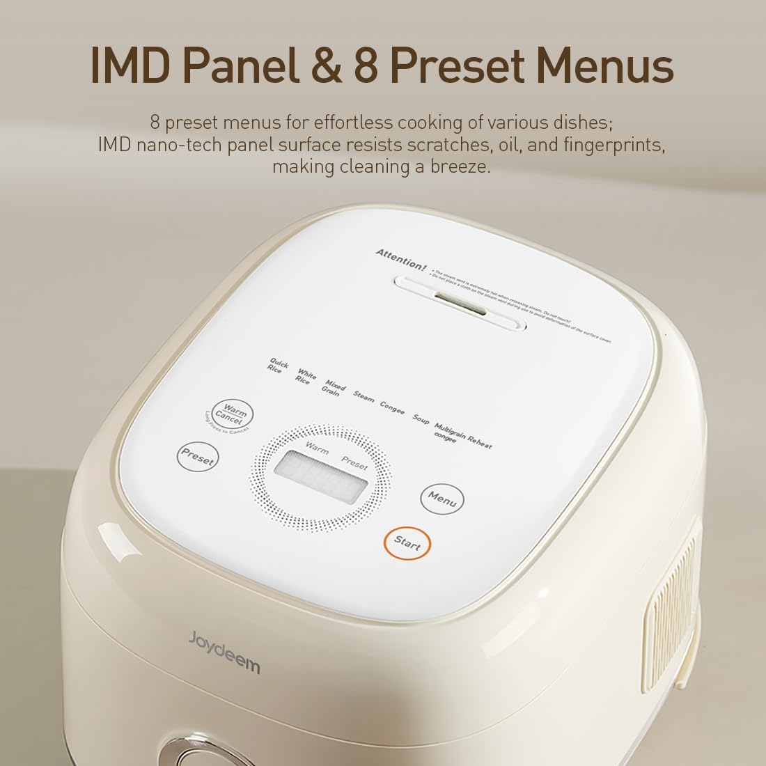 - 8 Smart Menu Functions: Equipped with versatile menu options including Quick Rice, White Rice, Mixed Grain, Steam, Congee, Soup, Multigrain congee, and Reheat, catering to various family dietary preferences. The durable, scratch-resistant IMD panel ensures long-lasting use and easy cleaning, adding convenience to your daily cooking.