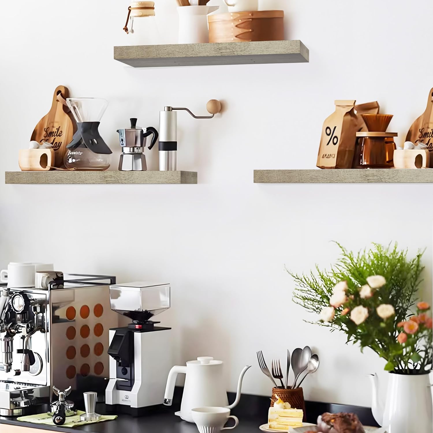 Colima Floating Shelves for Grey Wood Wall Shelf for Bedroom, 24 Inch Wall Mounted Floating Shelves for Bathroom Living Room Kitchen Office, 1.5" Thick Floating Book Shelves for Wall, Set of 3