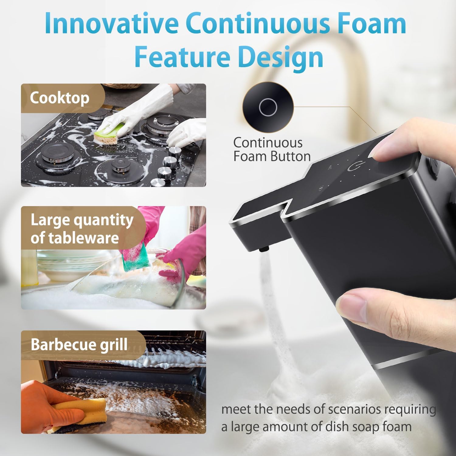 - 【Continuous Foam Design】 With a simple press of the continuous foam button, a steady stream of foam is effortlessly dispensed. This feature is perfect for tasks requiring large amounts of foaming soap, such as washing multiple utensils, cleaning stovetops, dining tables, barbecue grills, and more.