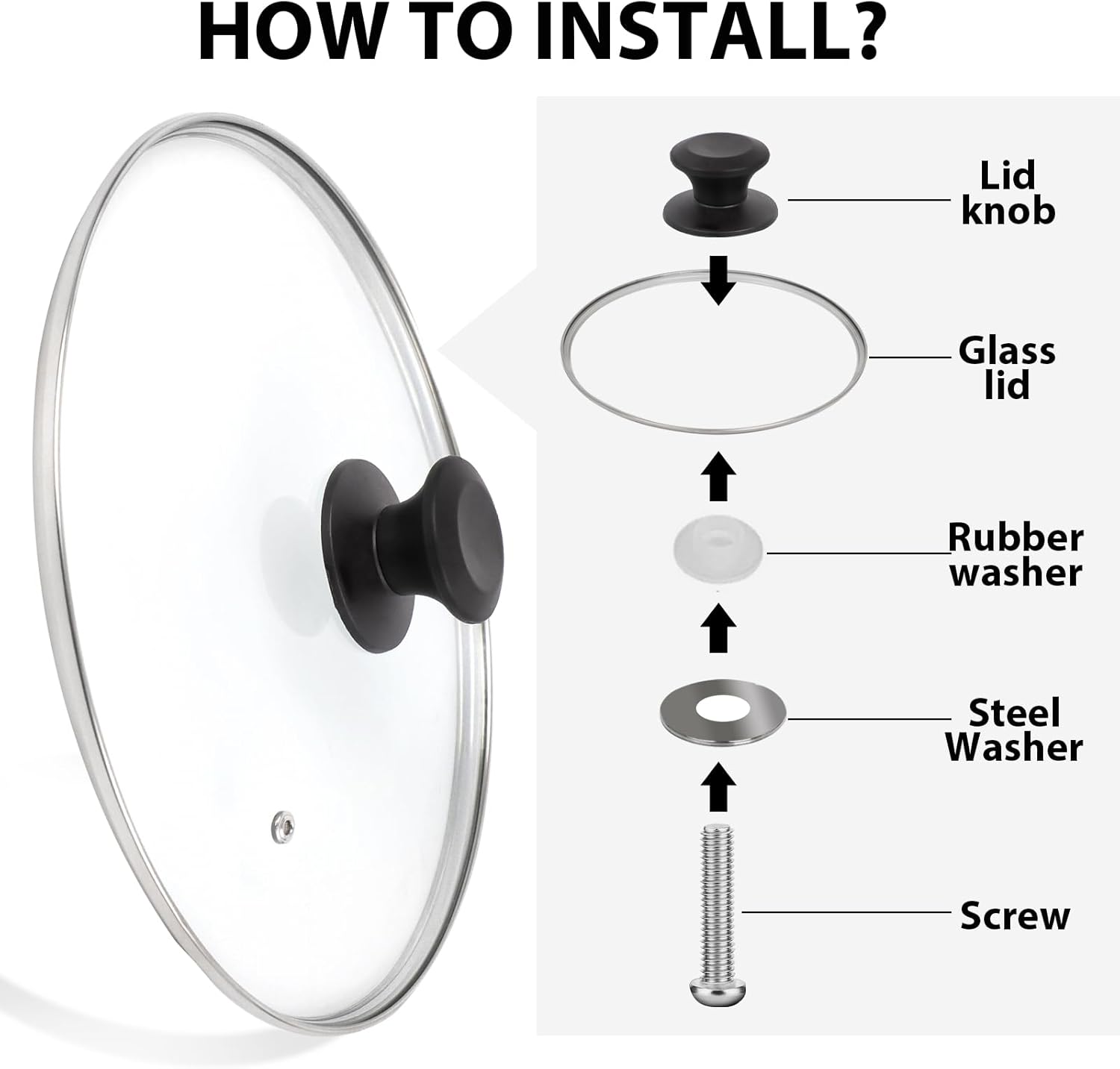 12 inch Tempered Glass Lid for Pots, Frying Pans and Skillets, Replacement Cover with Heat Resistant Black Knob Handle, Dishwasher Safe
