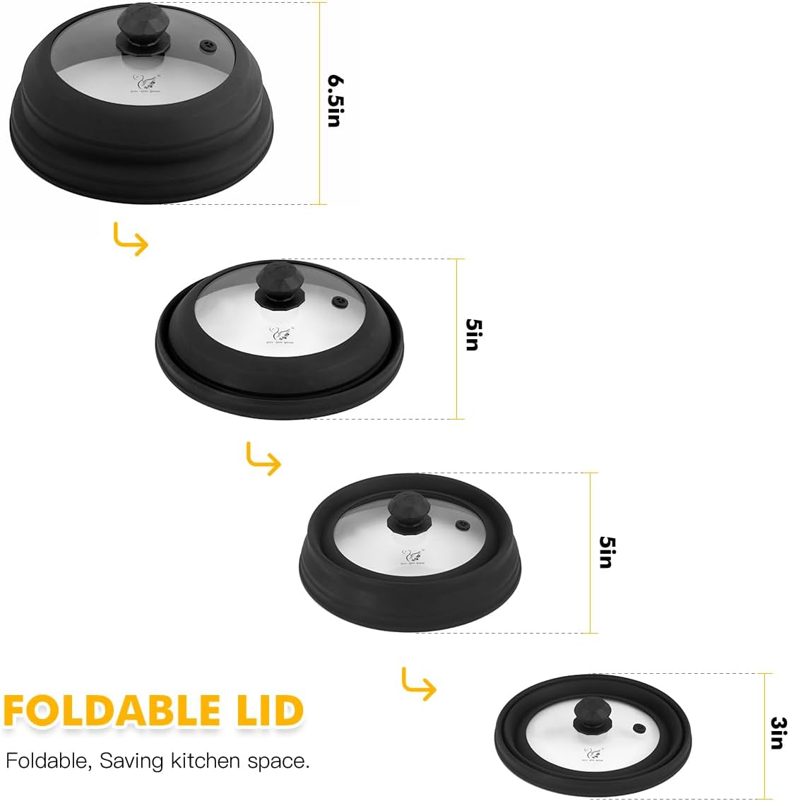 Microwave Splatter Cover Vented Glass Splatter Guard Lid with Collapsible Silicone for Food as Pot Cover Plate 9.8 inch Black