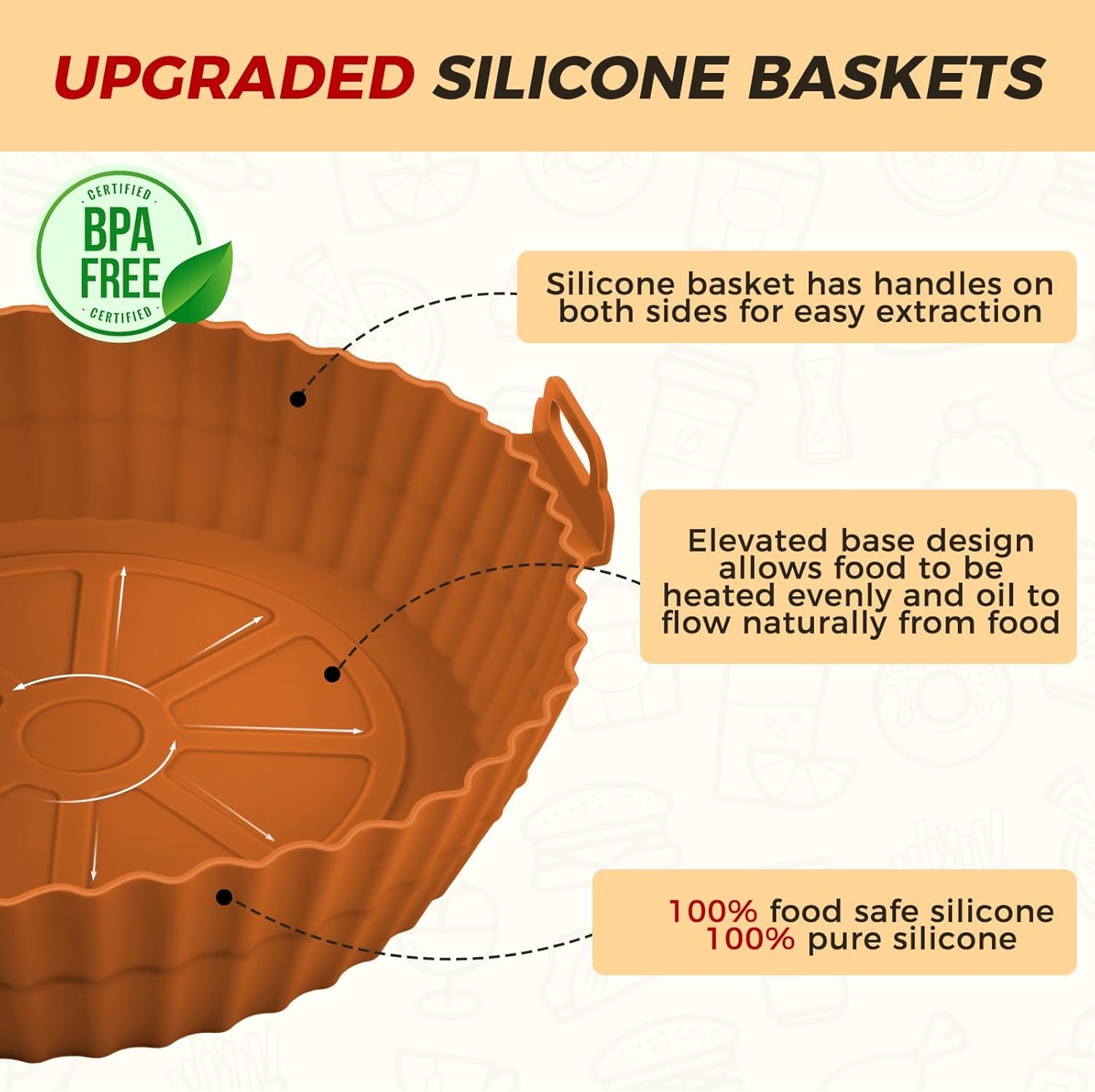 - 【Practical Design】- The reusable air fryer silicone pot have many raised lines, which improve the circulation of heat to fully heat the food for a more even doneness. Keep your bacon, breads, pizza, turkey, fries, buns integrity and nice look, and no effect on the taste of the food. Our silicone air fryer pot are designed with intimate handles on both sides to protect your hands from burns when removing the silicone pot. They are great kitchen air fryer accessories