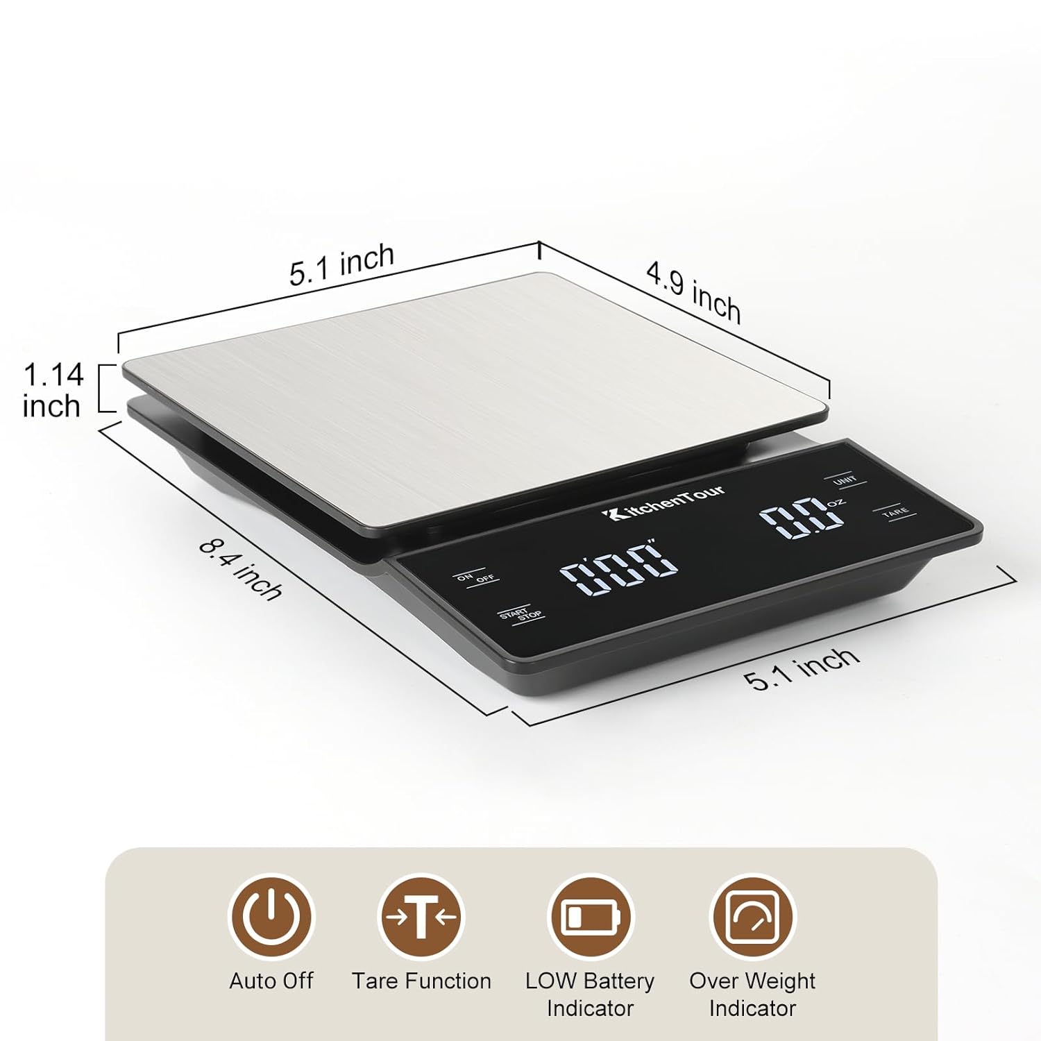 KitchenTour Coffee Scale with Timer 3kg/0.1g - High Precision Pour Over Drip Espresso Scale with Back-Lit LCD Display - Stain Steel Platform(Batteries Included)