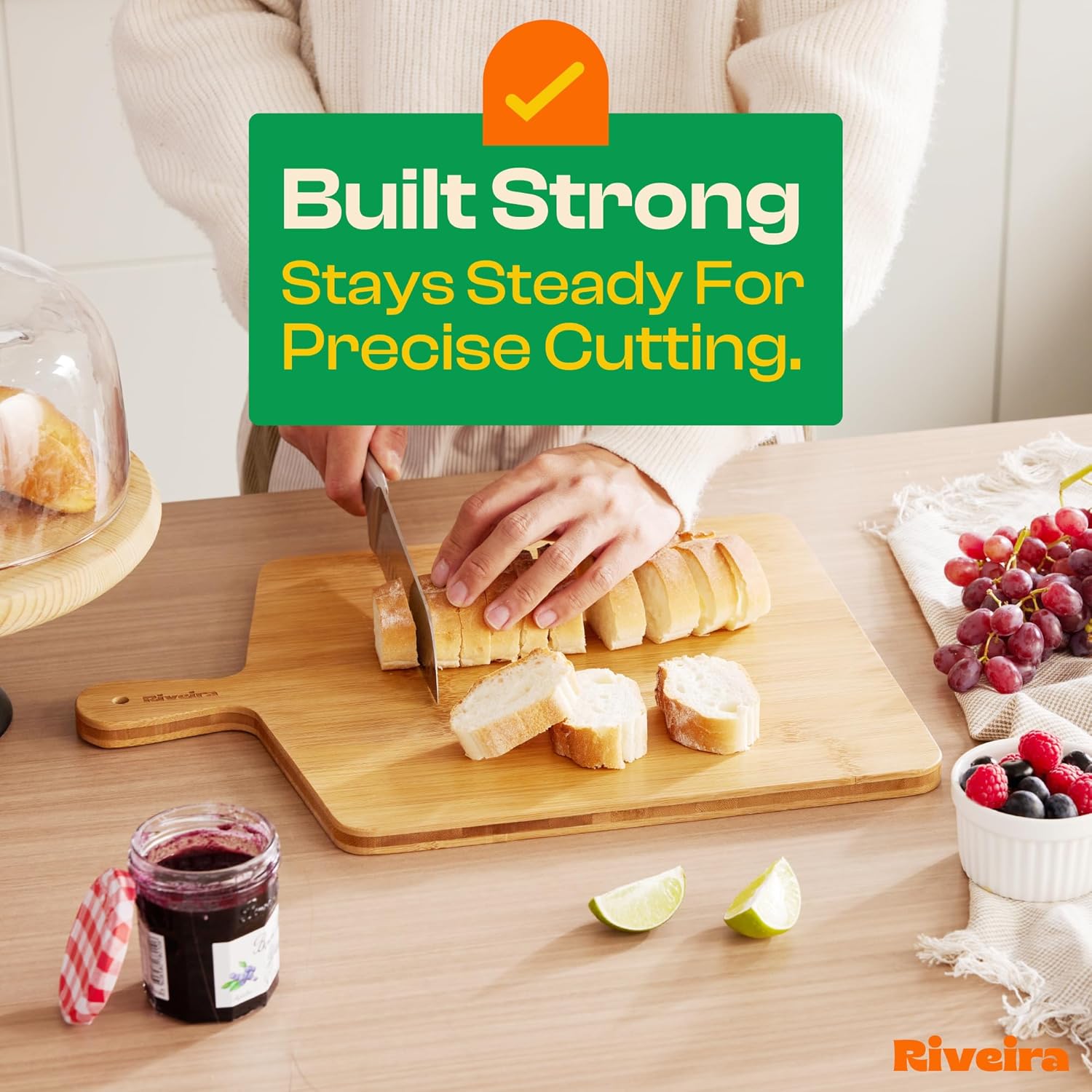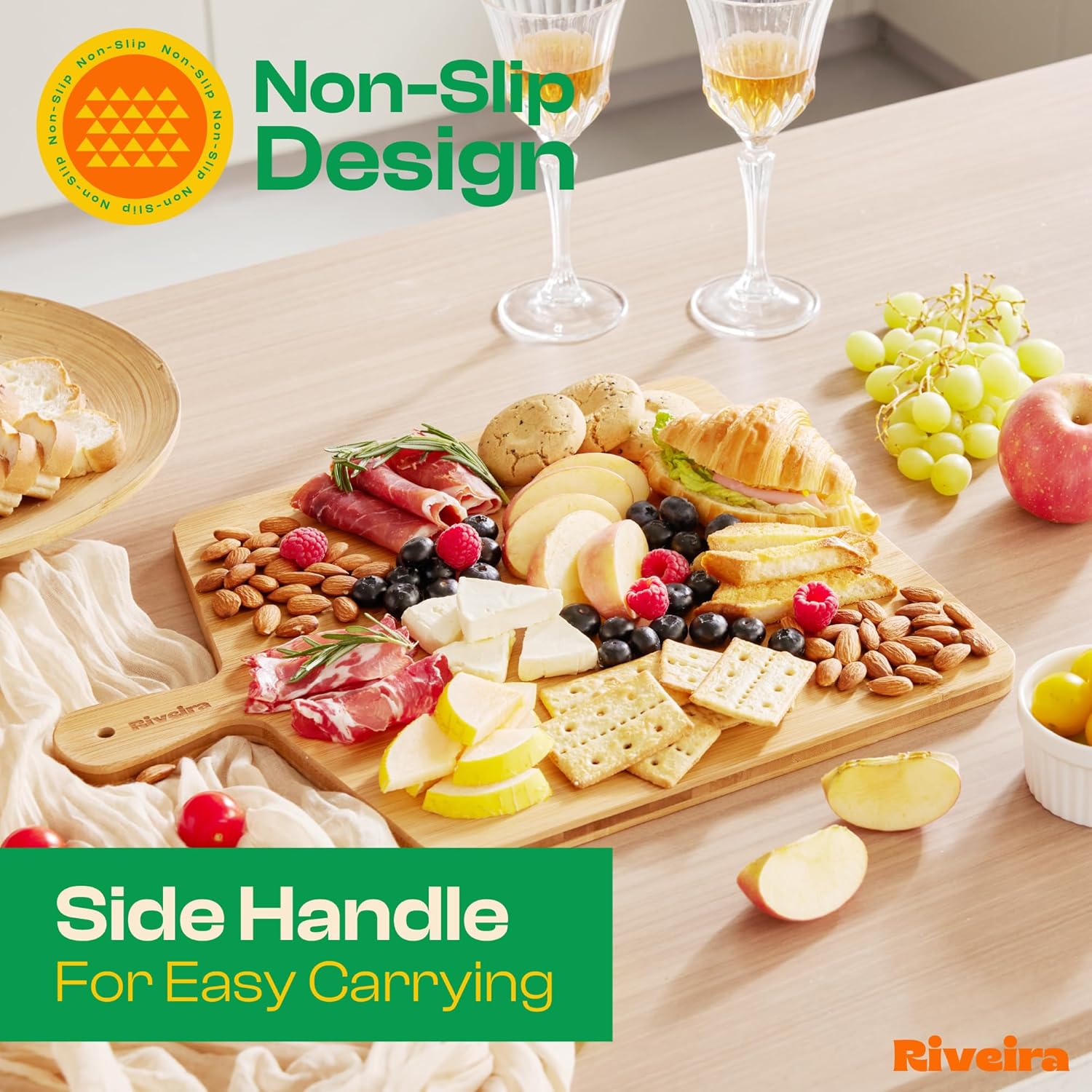 - Premium Crafted Bamboo — Take a detour from traditional kitchen aesthetics with this brown bamboo wood board crafted from 100% natural bamboo. Beyond being an unconventional and eco-friendly choice, the chopping board wood proudly showcases the environment friendly and organic bamboo. This wood cutting boards for kitchen counter adds an unexpected touch of confidence and style to your once-orderly culinary space. Riviera's wooden chopping boards for kitchen will be there for many years to come.
