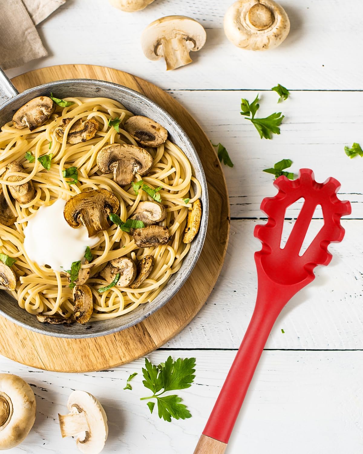 - Just Want To Provide The Best For You : The soft food-grade silicone head is designed for noise-free cooking. Unique sawtooth design, easy to pick up noodles. Whether it is used for stirring or serving spaghetti. Our silicone pasta fork will add more fun to your kitchen