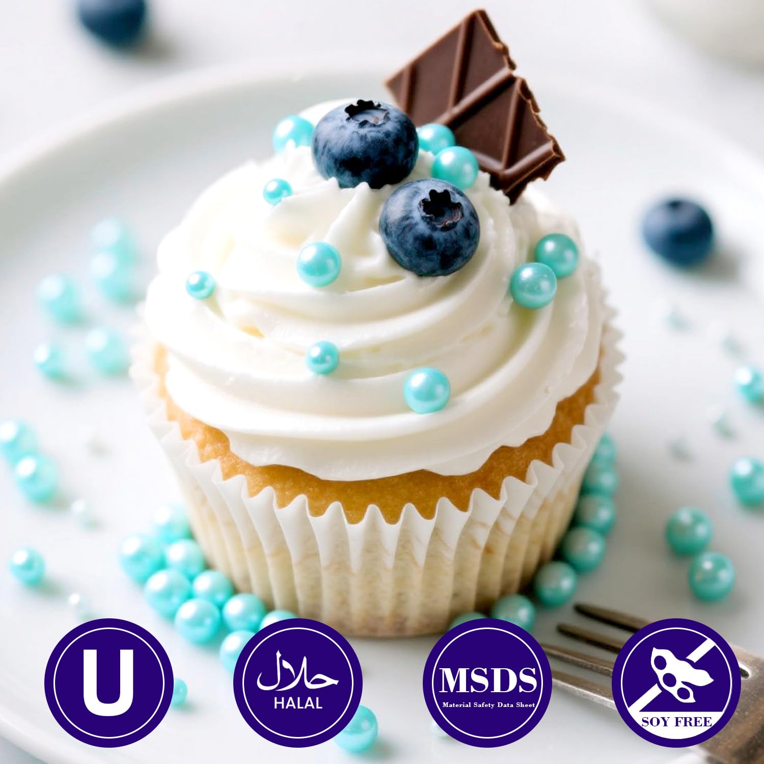 - Edible Blue Pearl Sprinkles with food-grade raw materials. Preservative Free, Nut Free, Dairy Free, Chemical Free, Soy Free, Non-GMO. Produced using food-safe standards, the process does not come into contact with allergenic substances and uses Tamper-proof food label. Have Kosher and Halal Certification.