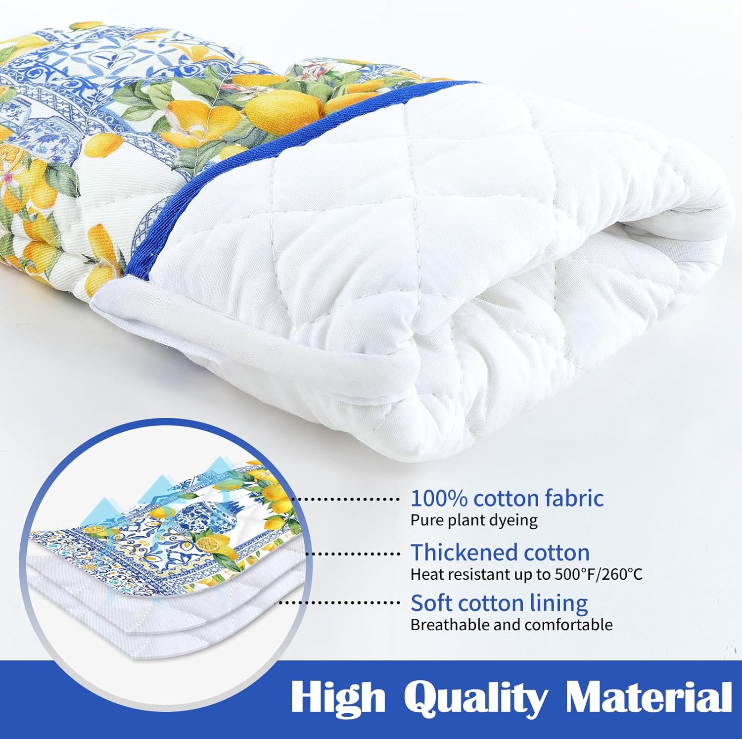 Yellow Lemon Oven Mitts and Pot Holders Sets 4Pcs, 100% Cotton Heat Resistant, Extra Long Oven Gloves Potholder for Kitchen Cooking Baking Decoration