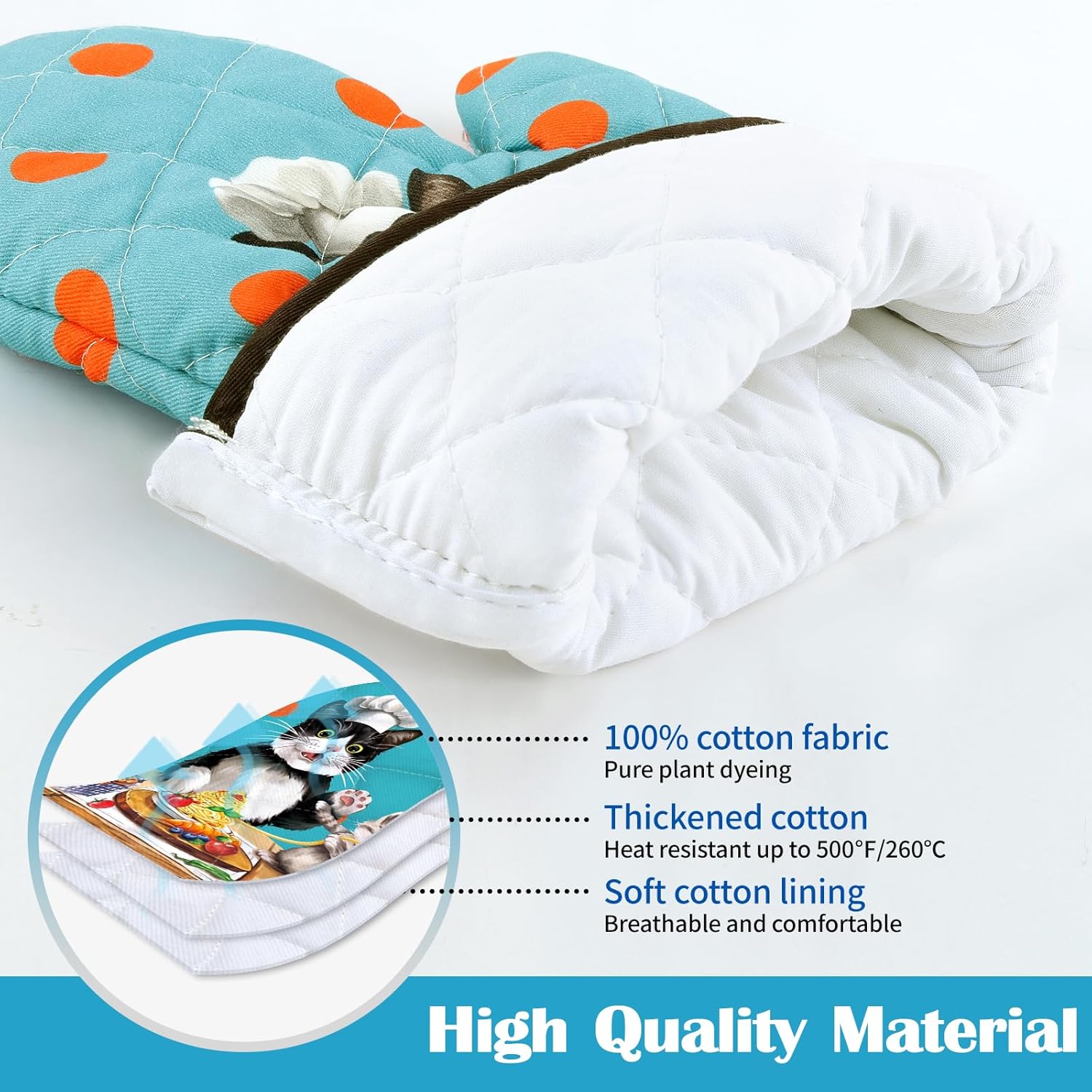 Cute Cat Oven Mitts and Pot Holders Sets 4Pcs, 100% Cotton Heat Resistant, Extra Long Oven Gloves Potholder for Kitchen Cooking Baking Decoration