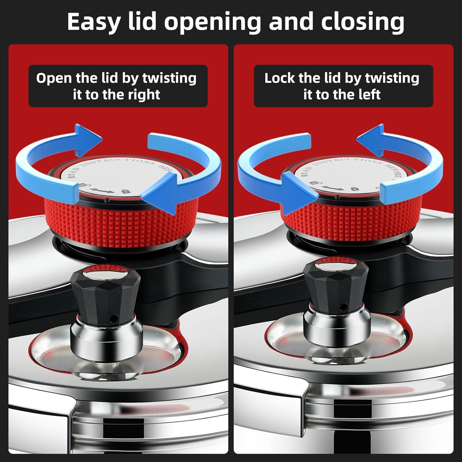 - β [Ergonomically designed handles]-Our pressure cooker is equipped with non-slip, anti-scalding, and easy-to-hold side handles to ensure safe use and long-lasting durability.