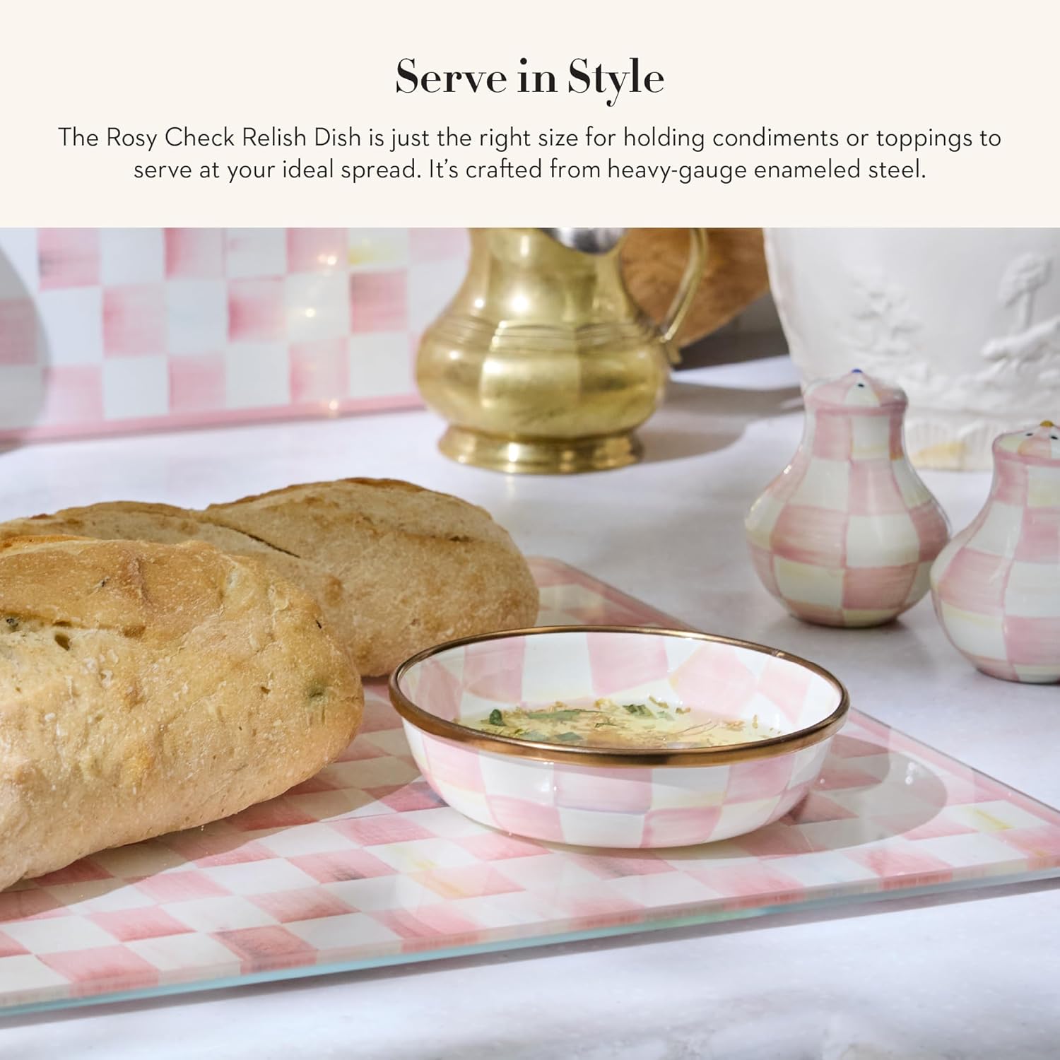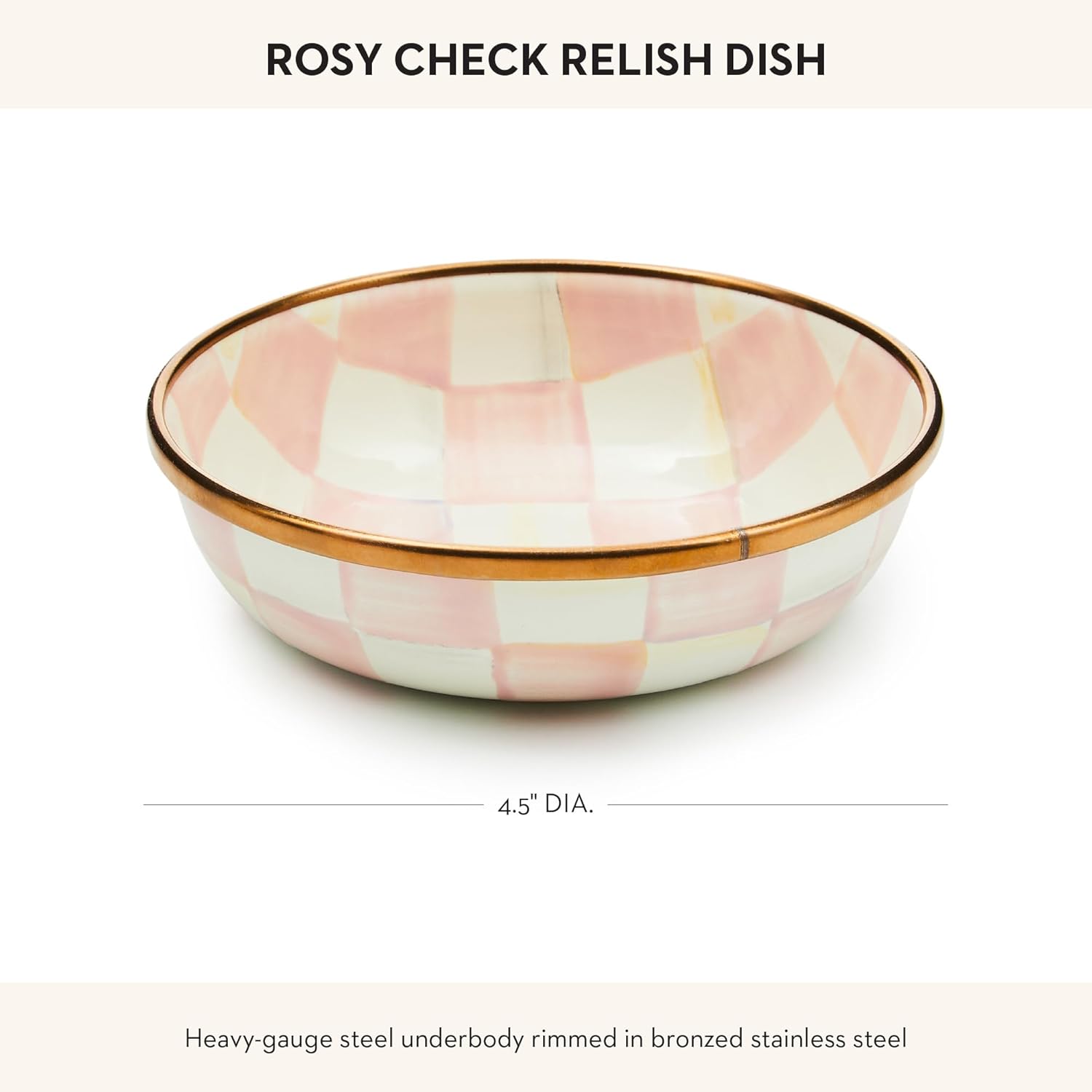 - ENTERTAINING ESSENTIAL: Accompany any dish with a tasty dip or sauce in this small bowl. It features our pretty Rosy Check pattern with glossy, high-contrast hand-painted pink-and-white checks on enameled steel.