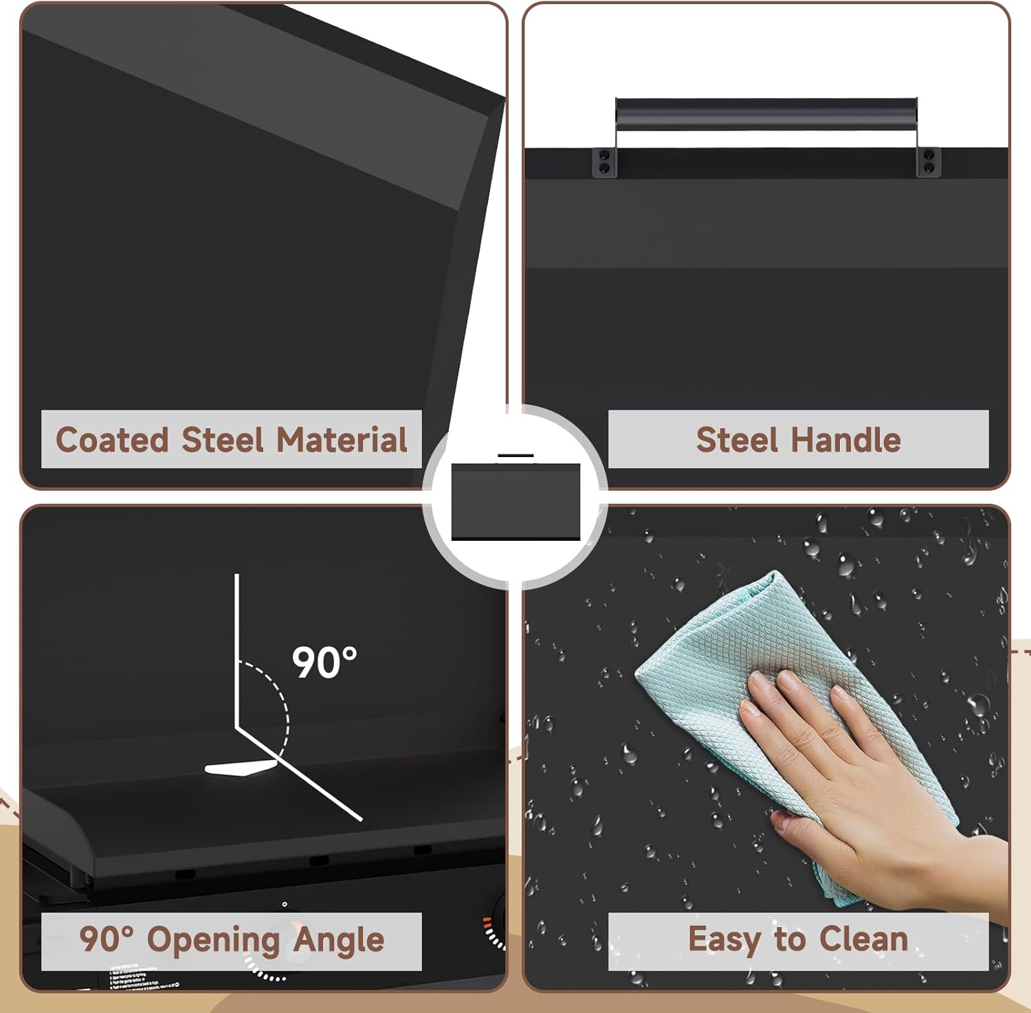 - 36 inch griddle cover: griddle hinged lid is easy to clean, just wipe with a damp cloth or washwith water. If you have any problem in using the grill lid, please feel free to contact us, we will provide you with professional after-sales service
