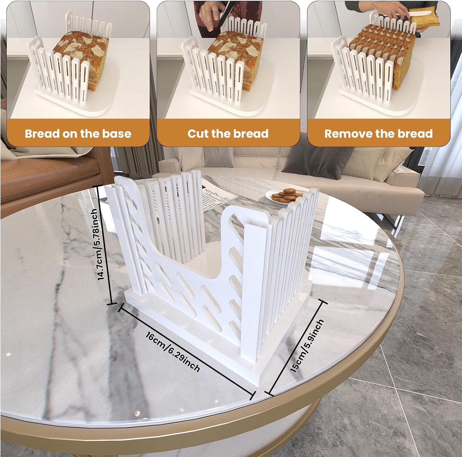 - 【ADJUSTABLE BREAD SLICER】The slicing guide can be adjusted to different widths according to your preferences, ensuring uniform and standard thickness for various bread types. The bread slicer is compact and easy to use, save kitchen countertop space.