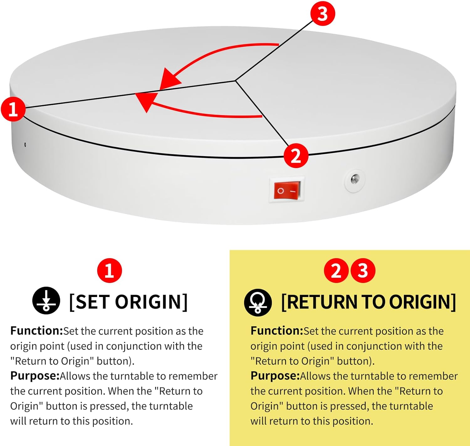 - 【This motorized turntable includes a Professional Flagship Remote Controller】:Precise angle settings and user-friendly combination key design enable support for a wider range of applications. Support: Set the current position as the origin point (used in conjunction with the "Return to Origin" button). Support: Save the current settings to the turntable's internal flash. More versatile angle buttons and mode button combinations provide greater flexibility for various applications