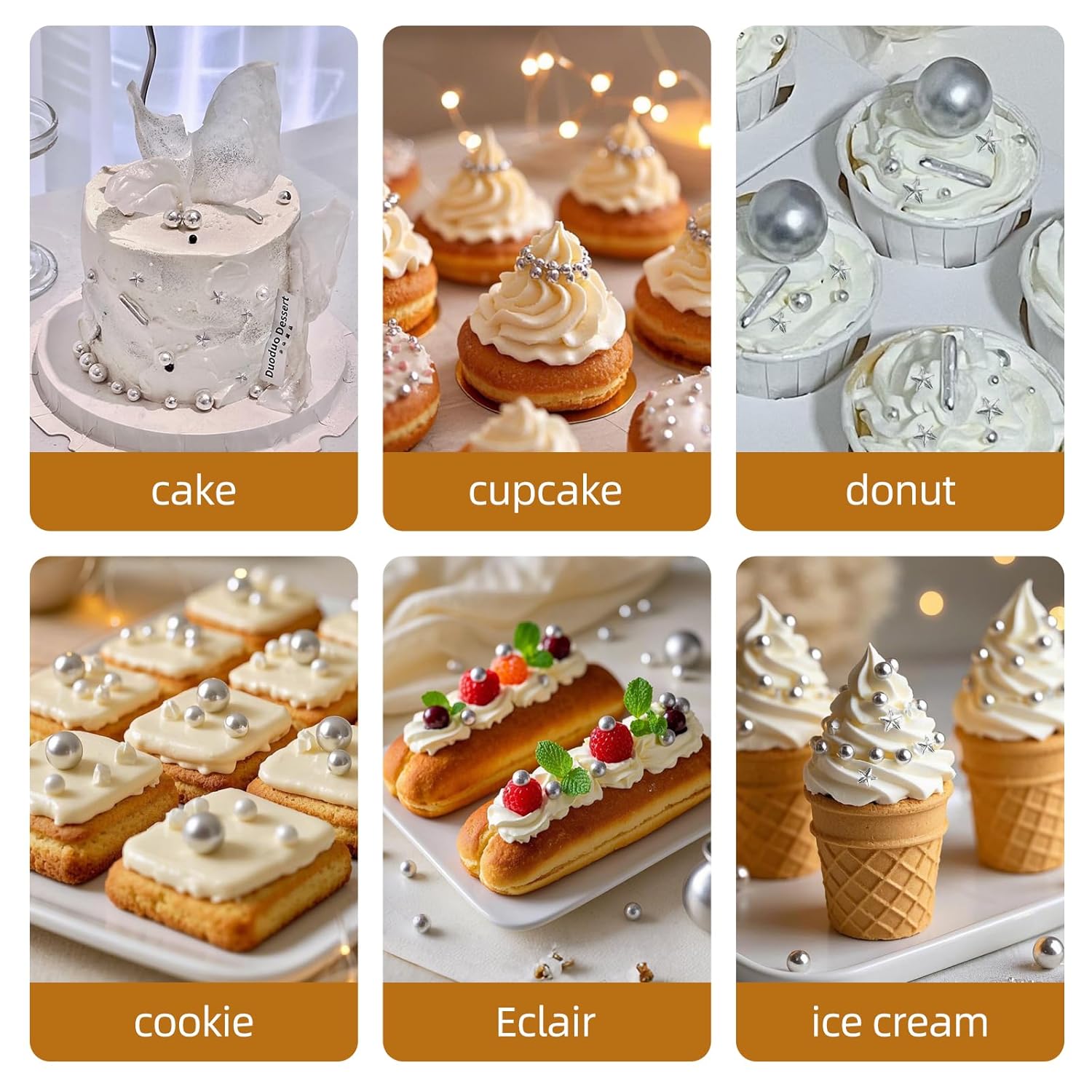 - Versatile Dessert Decoration: Our sprinkles includes different sizes of Silver beads and rods stars perfect for meeting all your baking decoration needs.The sugar decorations are edibled candies. It is normal for large candies to have a hard texture and can be eaten with confidence.After baking, decorate the cookies or cake with pearl sugar to avoid melting