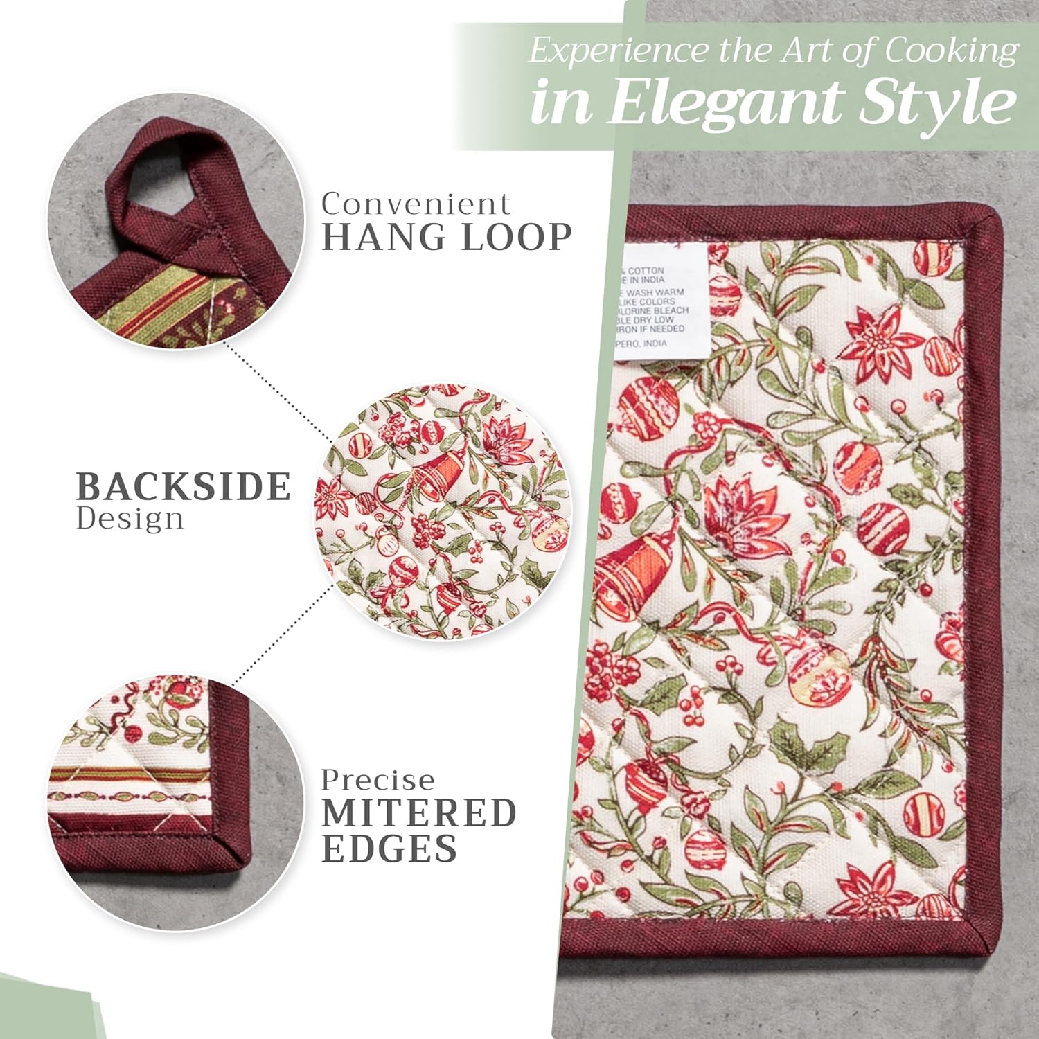 - Package includes: 2 pot holders measures 8"x8". Ideal as a hot pad for dishes, coffee pots, cast iron pans, or cookware. Designed in Europe and Made in India, it blends style, function, and comfort into a daily kitchen essential
