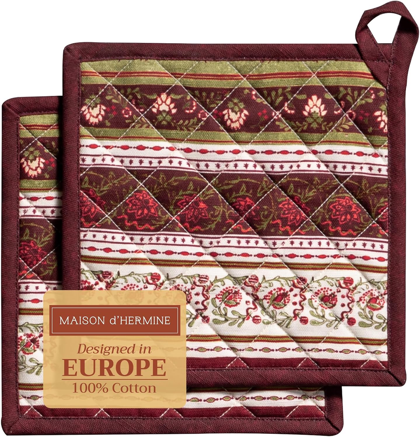 Maison d' Hermine Pot Holders Set 100% Cotton Heat Resistant Potholders 8" x 8" Hot Pads with Loop BBQ, Cooking, Baking, Grilling, Kitchen, Handling Hot Pans (Pack of 2, Reveillon Au Jardin)