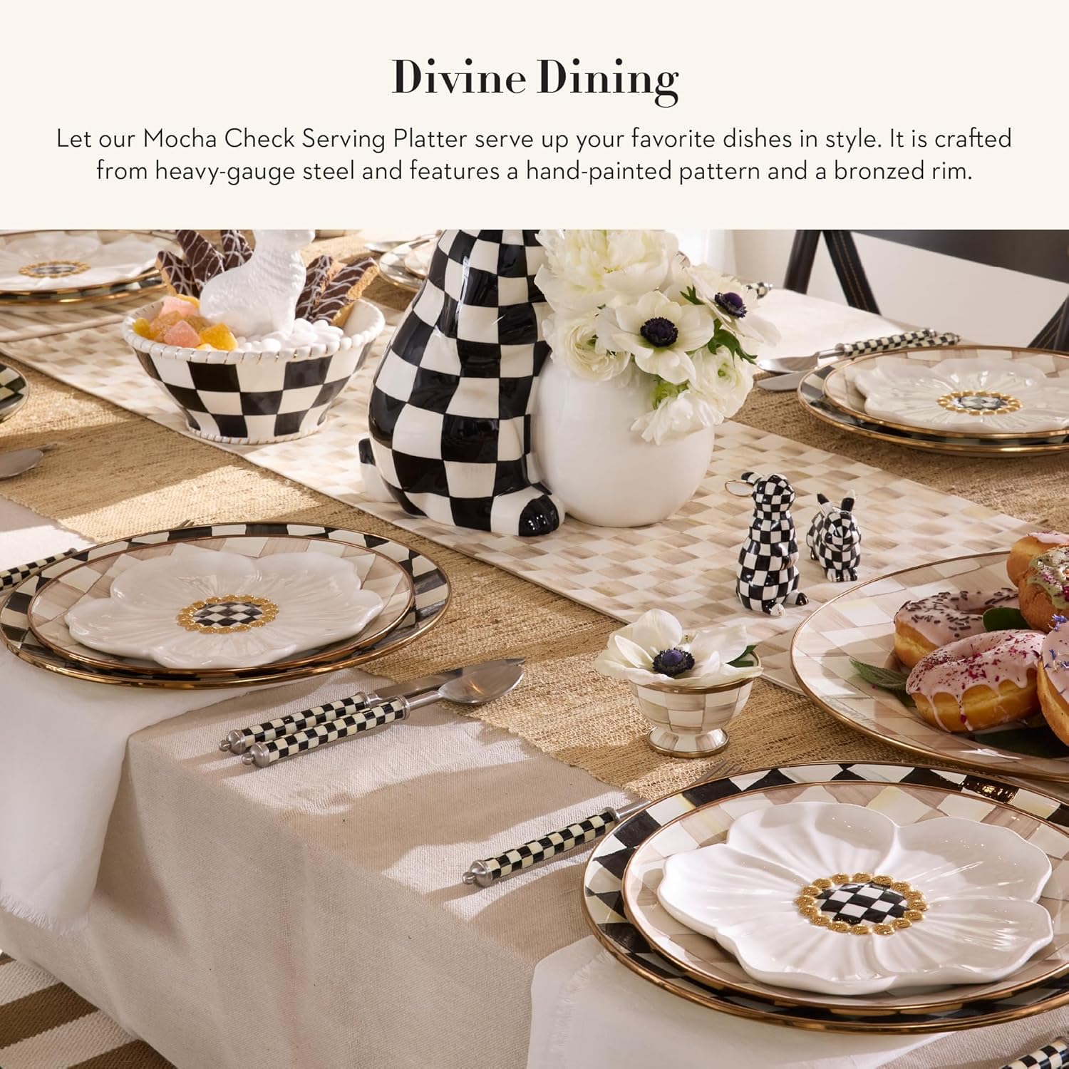 - ENTERTAINING ESSENTIAL: Serving dishes for entertaining don’t get any more charming than this. Our Mocha Check food platter features a hand-painted brown-and-white checkered pattern, a heavy-gauge steel underbody, and a bronzed stainless-steel rim.