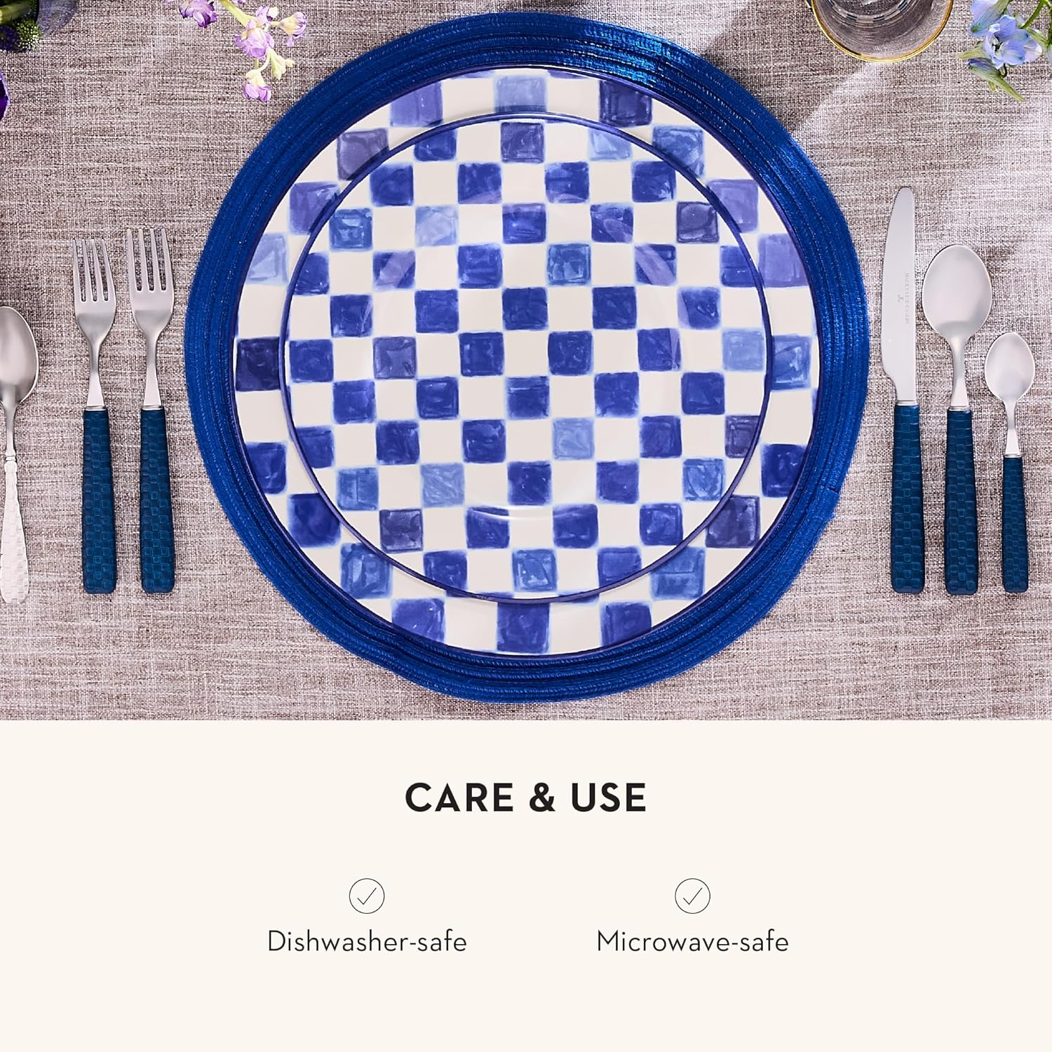 - SERVING ESSENTIAL: Create a fun table with this entrée or dessert platter. The Indigo Check round serving plate features hand-applied check transfers in shades of blue and is finished with a hand-painted rim.