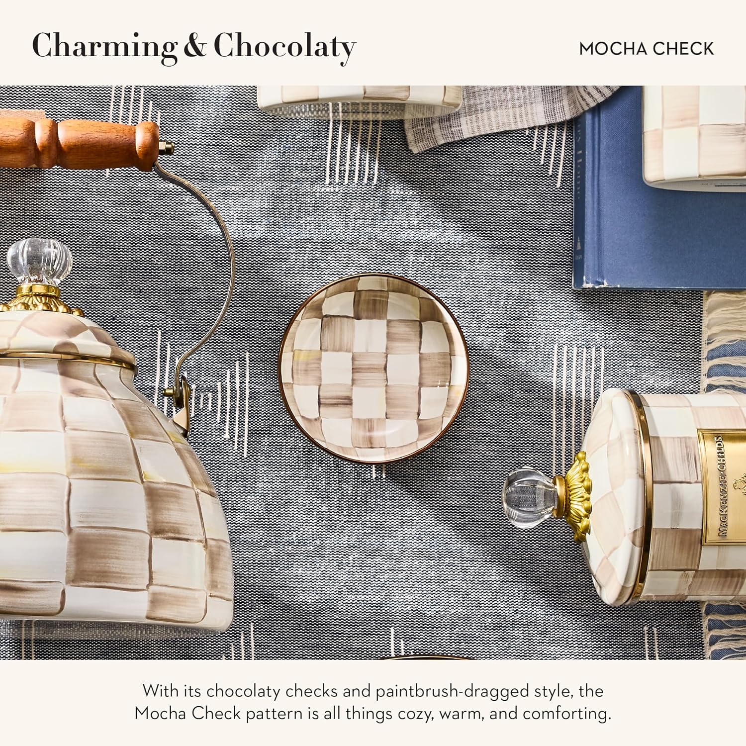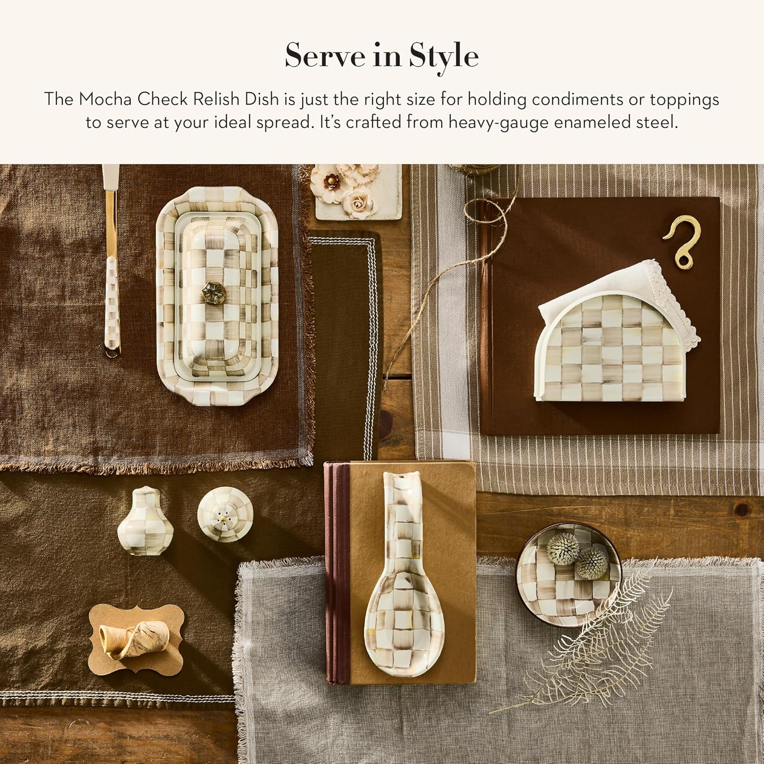 - ENTERTAINING ESSENTIAL: Elevate your serving dishes for every single snack or meal with our Mocha Check small bowl for relish. It features hand-painted, color-dragged brown-and-white checks on enameled steel and has a bronzed stainless-steel rim.