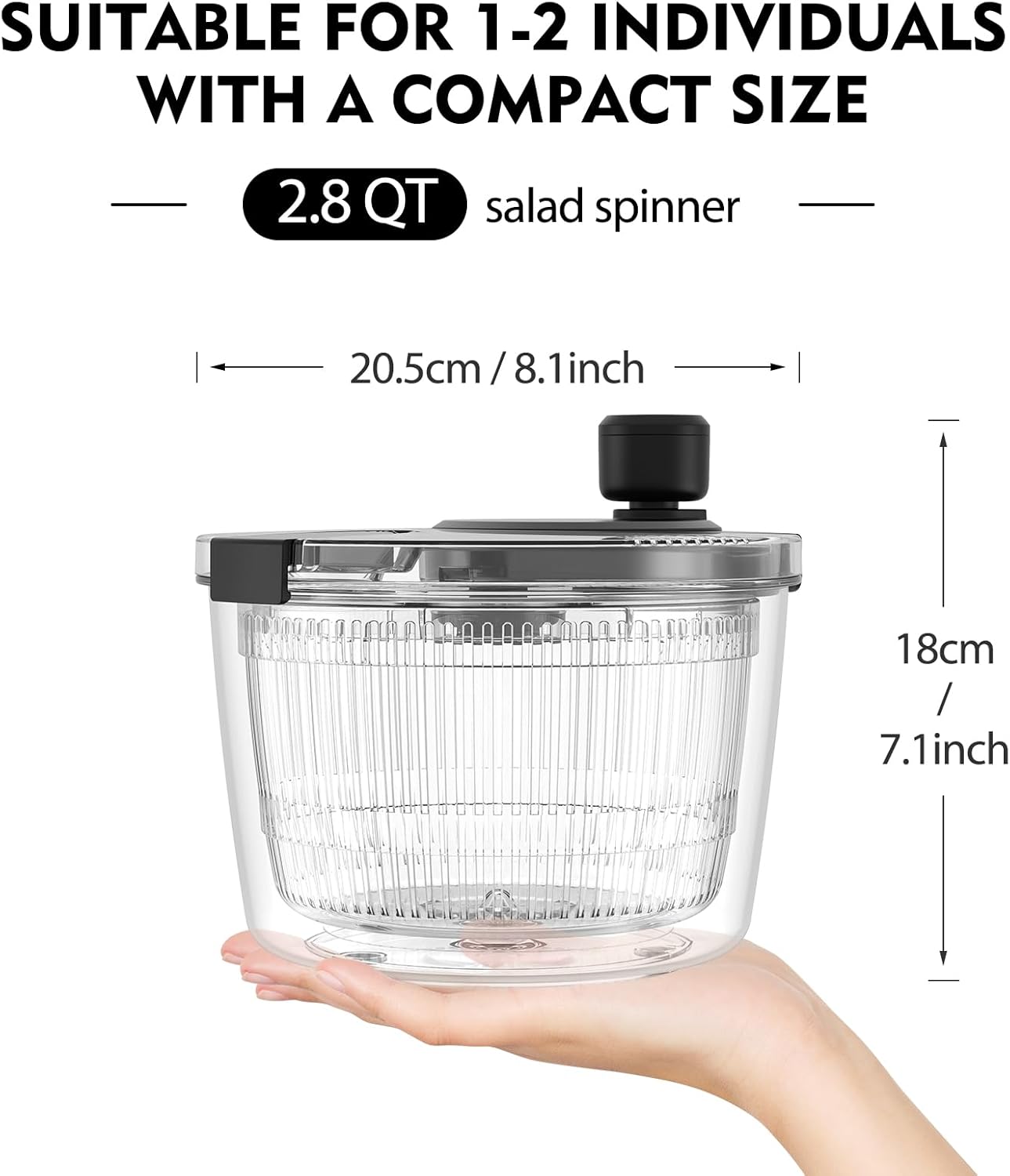 - Multi-functional design: The transparent bowl doubles as a serving bowl, letting you go straight from spinning to serving your salad without transferring to another container. The inner strainer basket can also be used as a colander, making it a versatile tool for rinsing and draining fruits, vegetables, or macaroni