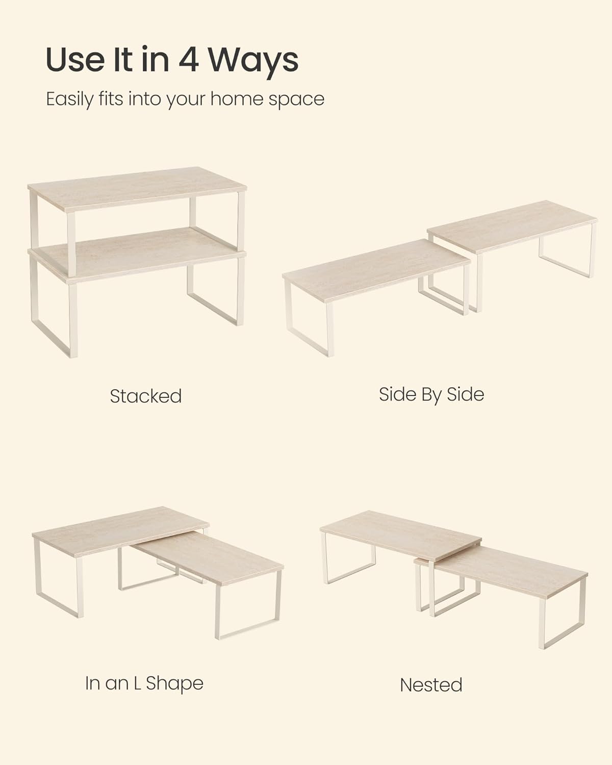 - [Adjustable] With their unique design, with one slightly smaller than the other, these shelf organizers can be stacked on top of one another, nested, used separately, or even in an L-shape. Adjust them how you want to perfectly fit your kitchen space