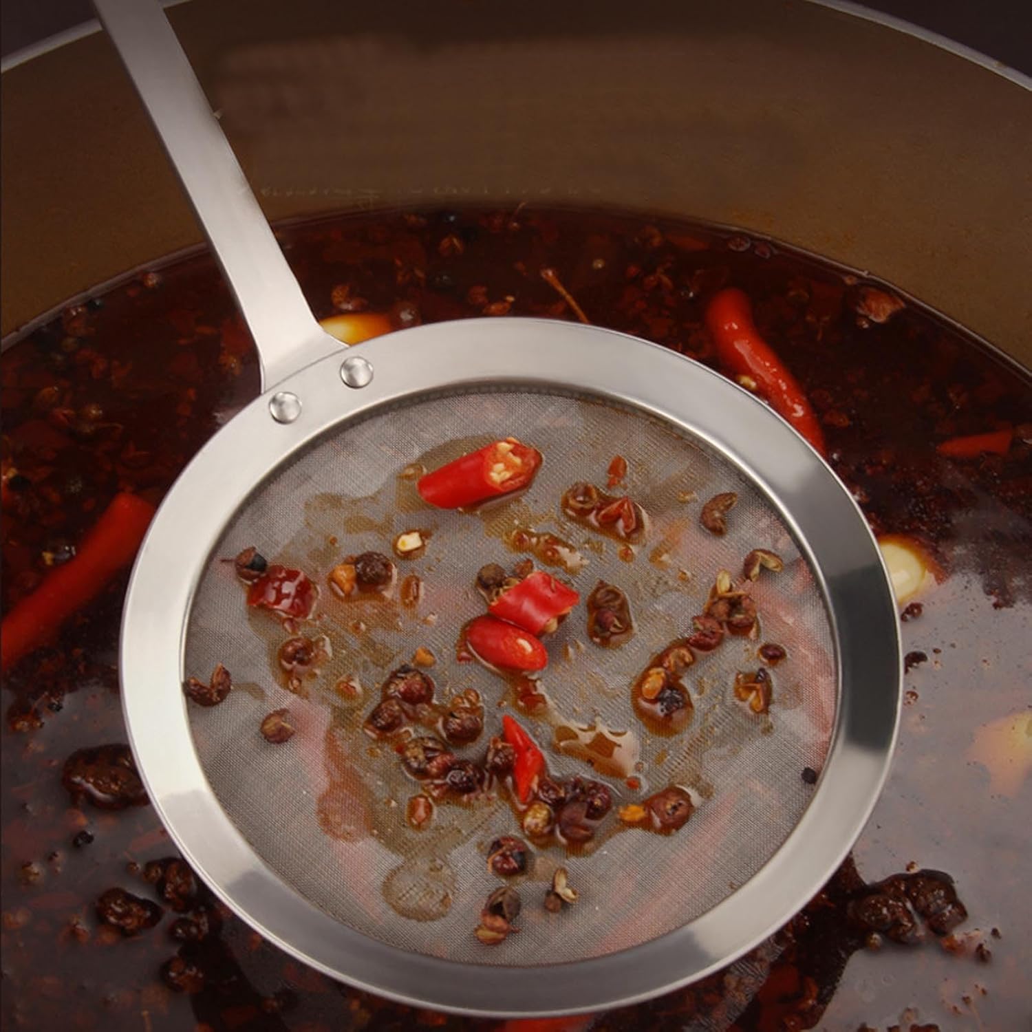 - The fine mesh strainer, skimmer spoon can separate a lot of fine materials. Our mesh strainer features a stainless steel wiring, and long handle is perfect for giving you both maneuverability and security when scooping up the bits of breadcrumbs from oil when deep frying and vegetables from water. Perfect for separation of the floating foam, fat, grease, filtering quinoa, miso and grains.