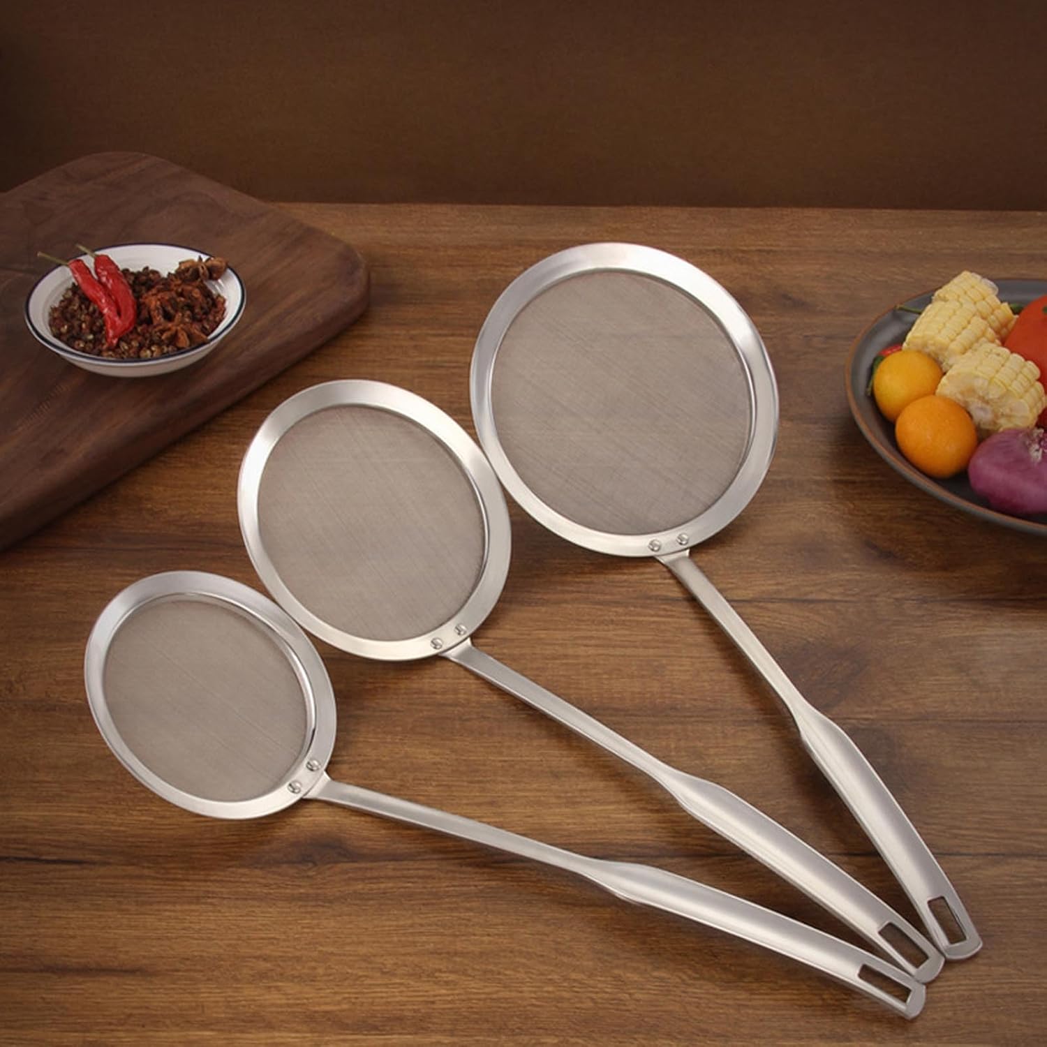 - The fine mesh strainer, skimmer spoon can separate a lot of fine materials. Our mesh strainer features a stainless steel wiring, and long handle is perfect for giving you both maneuverability and security when scooping up the bits of breadcrumbs from oil when deep frying and vegetables from water. Perfect for separation of the floating foam, fat, grease, filtering quinoa, miso and grains.