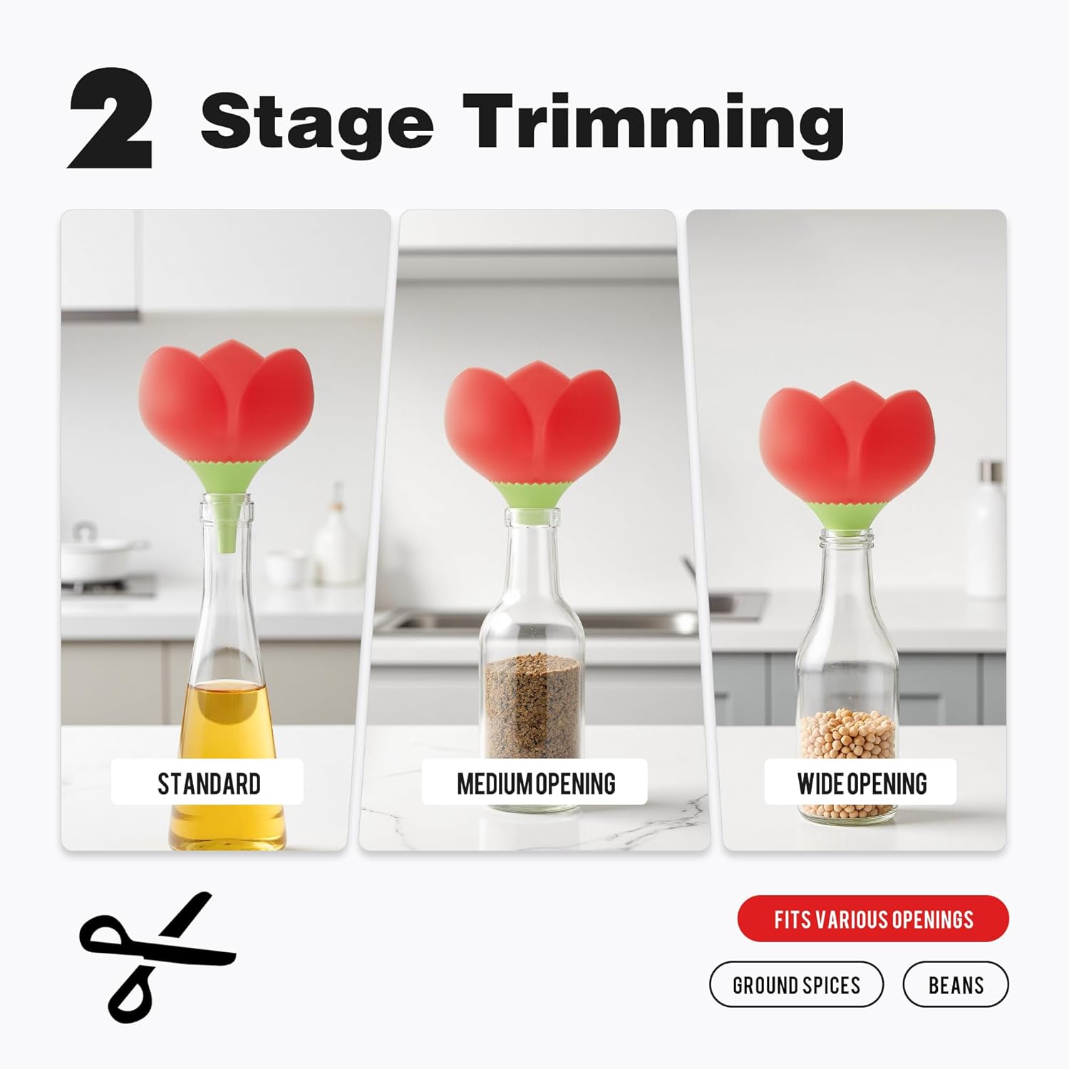 - Unique Design: The funnel for kitchen has an interesting appearance, a uniquely designed wide opening for easy pouring, and a smooth one-piece design that is ideal for filling bottles, jars and containers, the funnel spout is graduated with a notch, so you can cut part of the notch to increase the size of the spout to fit the mouth of the bottle