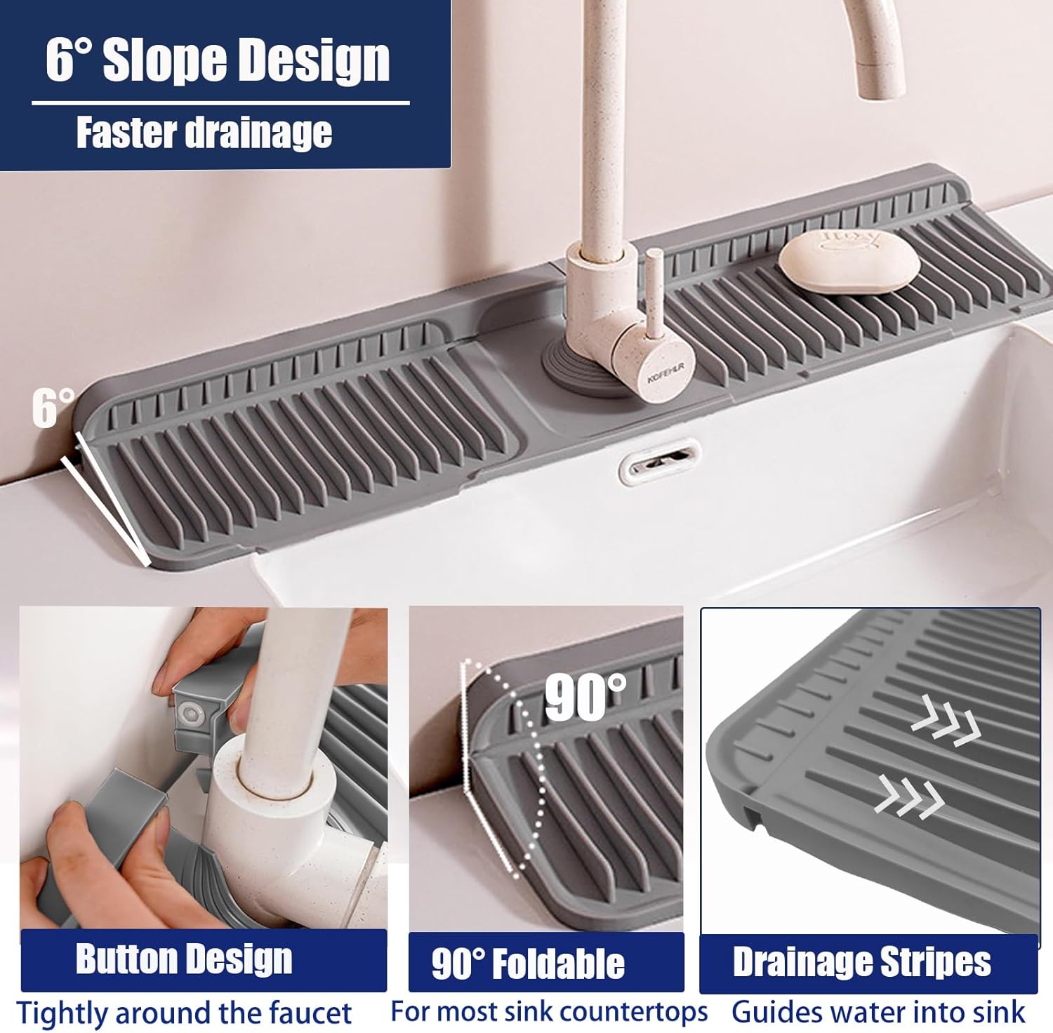 24" Silicone Faucet Mat for Kitchen Sink,Folding Sink Splash Guard Behind Faucet,Fasten Button & 6° Slope Design Faucet Drain Mat for Kitchen and Bathroom,Faucet Draining Mat(Gray)