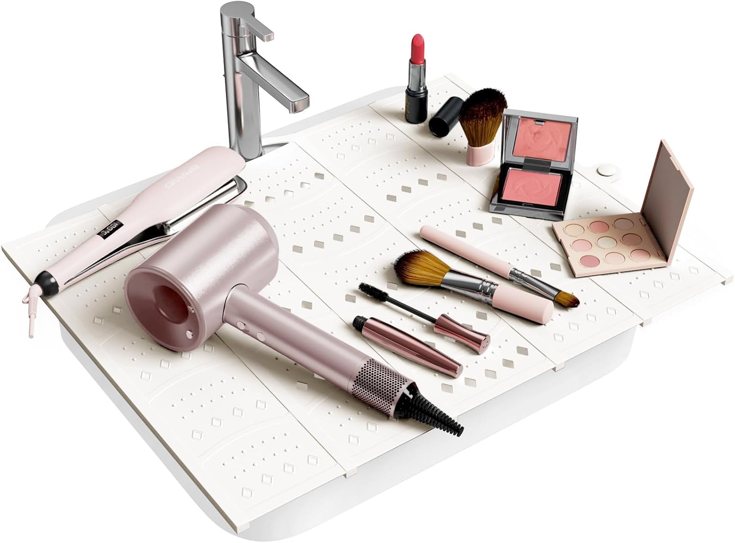 Bathroom Sink Cover for Counter Space, Sink Mat Foldable Sink Cover, Silicone Makeup Organizer Mat Space Saver, Small Bathroom & Rv Camper Travel Must Haves Accessories, Pearl