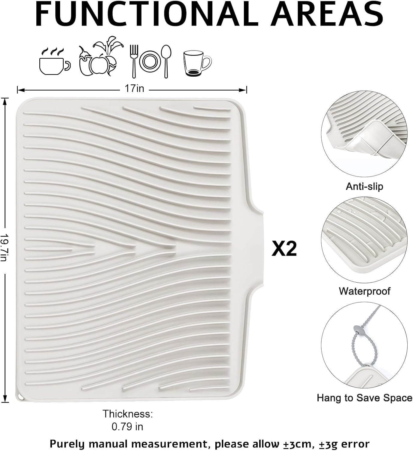 Dish Drying Mat, Stone Drying Mat for Kitchen Counter with Built-in Drain, Non-Slip Drying Matt Kitchen Counter, Heat Resistant Silicone Drying Mat, Dish Drying Pad, 2 Pcs (Cream 19.7" x 17")