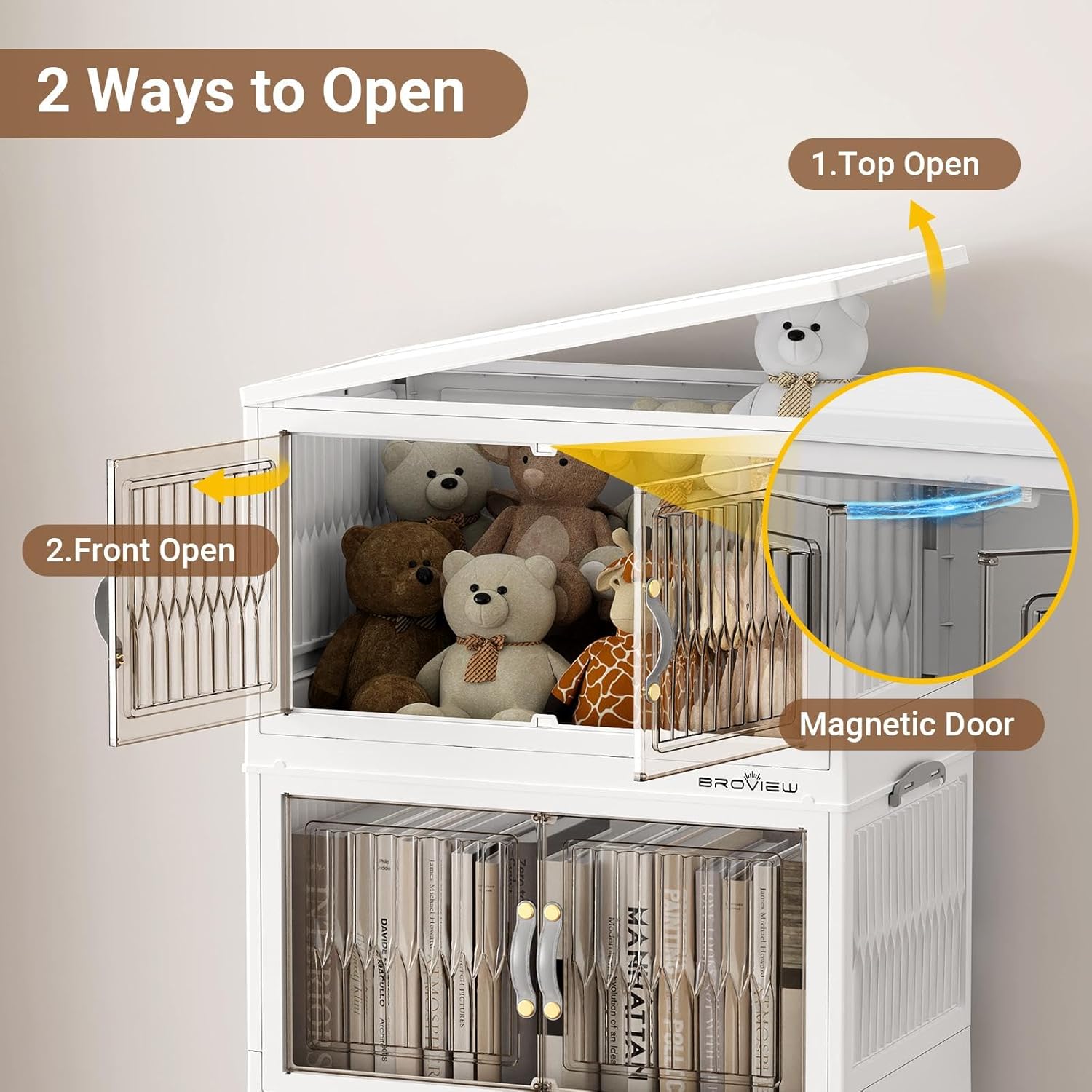 - 【Magnetic Front Open Doors & 4x Wheeled】The large storage bins with doors provide two options: front doors opening or top lid opening. The brown door can be easily seen through and with a magnetic device. The 4x 360-degree rotating wheels all have fixed functions and can be easily moved by releasing the valve, making them friendly to the elderly.