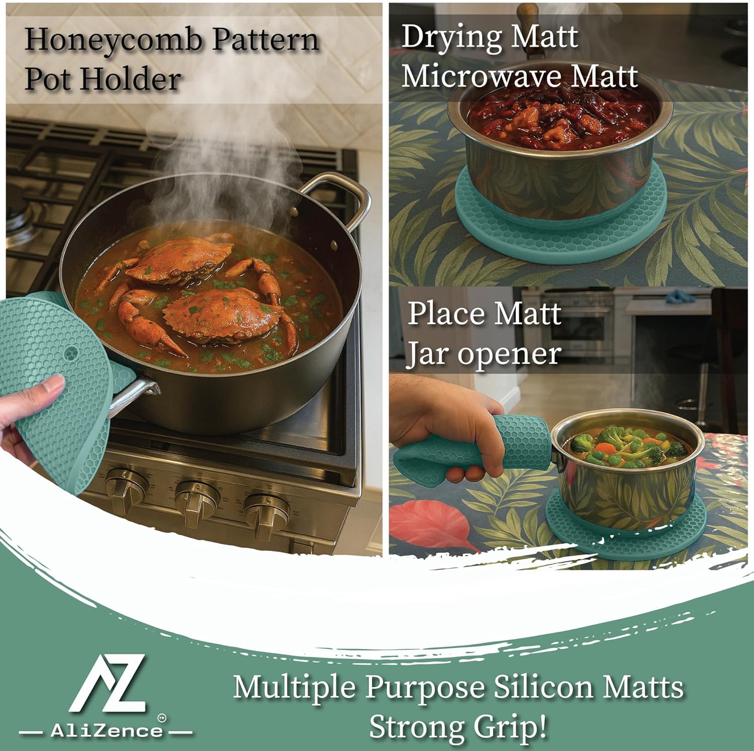 - Protective Hot Trivet Mats: The round heat-resistant mats in this set are perfect for protecting your countertops and dining surfaces from hot cookware. Made from high-quality silicone, these mats are designed to absorb and dissipate heat, preventing burns, stains, or heat damage to your kitchen surfaces. Whether you're setting down a hot pot or baking sheet, these trivet mats will keep your countertops safe and looking pristine.