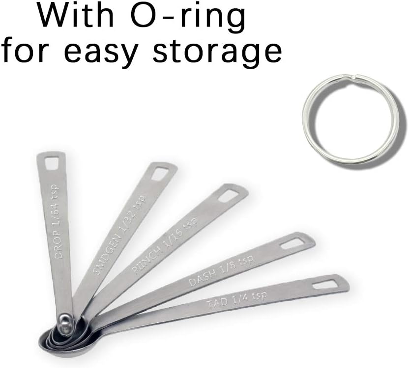 - EASY TO STORE: Set Contains 5 spoons: 1/64-tsp, 1/32-tsp, 1/16-tsp, 1/8-tsp, 1/4-tsp. Conveniently connected by a O ring which helps to keep the spoons together after a full day of baking or cooking