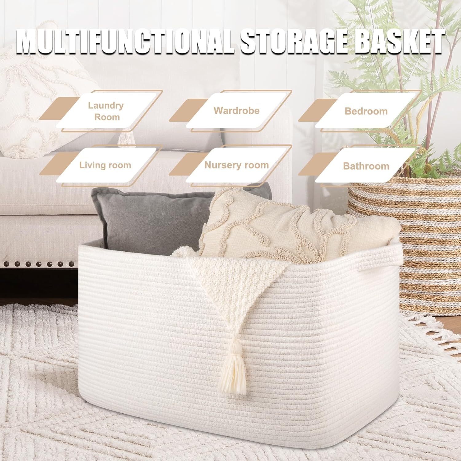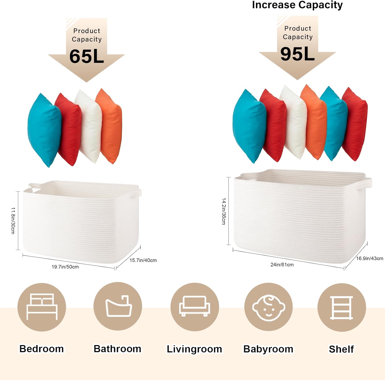 95L Large Storage Basket, Cotton Rope Woven Blanket Basket, Toy Storage for Baby Room, Living Room, 24" x 16.9" x 14.2", White