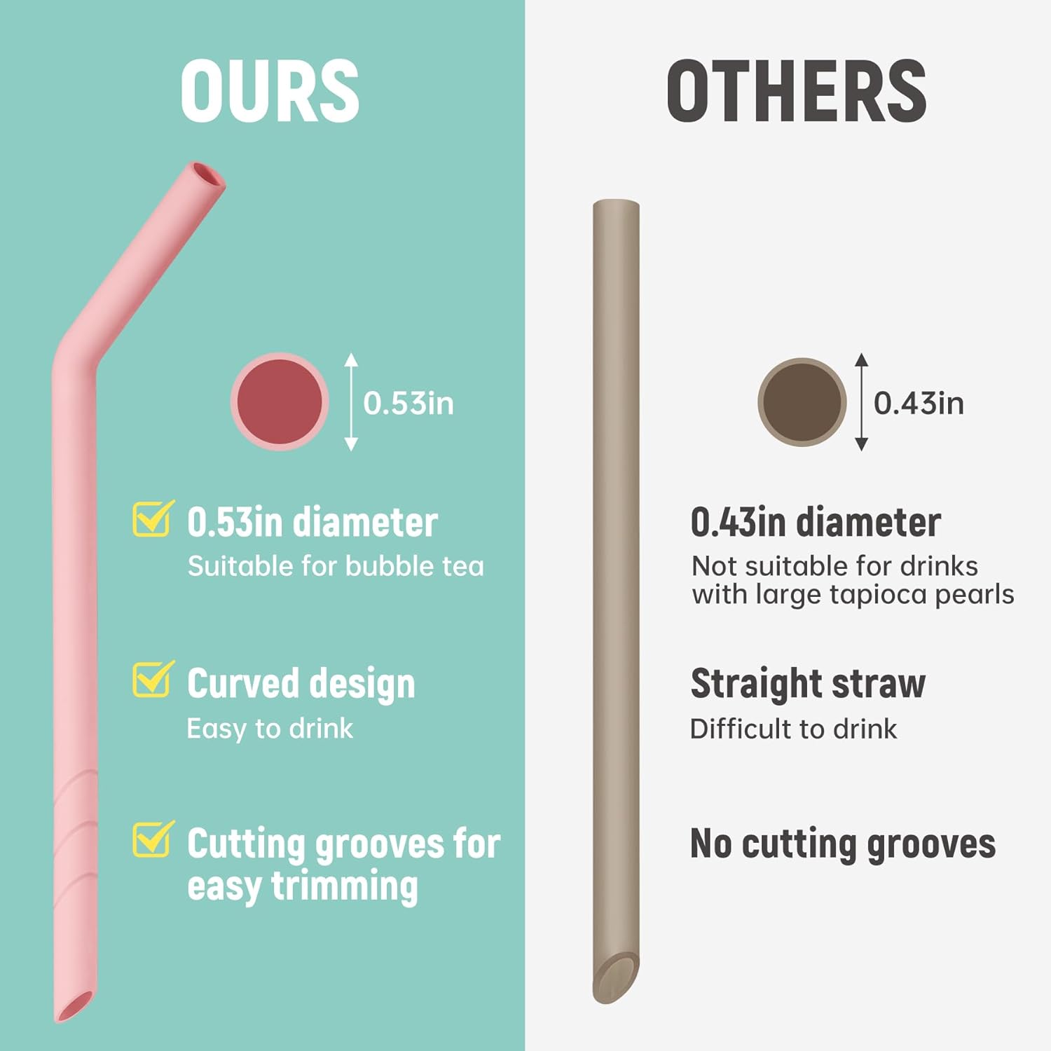 - Perfect For Thick Beverages: Say goodbye to struggling with boba pearls or smoothies! These reusable silicone straws feature a widened inner diameter (0.39 inches) that effortlessly handles chunky toppings and viscous drinks.