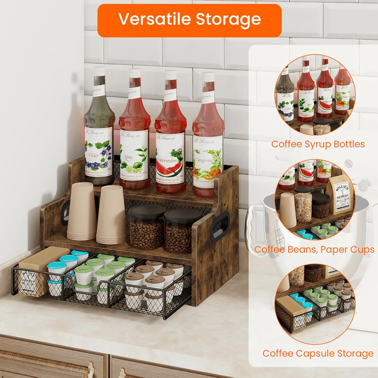 - Space Saving: Our 3 tier coffee syrup organizer can stand 8 syrup bottles and has a pull-out coffee pod drawer basket that can store 35 coffee capsules. Stepped design allows for neat placement and easy access to your favorite syrup