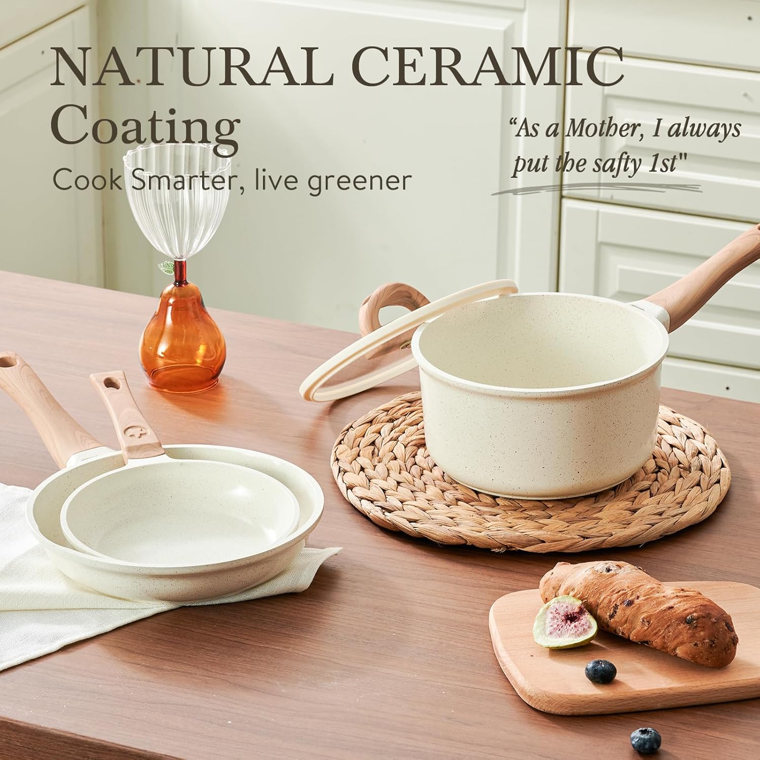 22 Pcs Pots and Pans Set Non Stick Non-Toxic Ceramic Kitchen Cookware Sets Nonstick Pot&Pan With Lid Cream White Granite Induction Compatible with Glass Lids Crepe