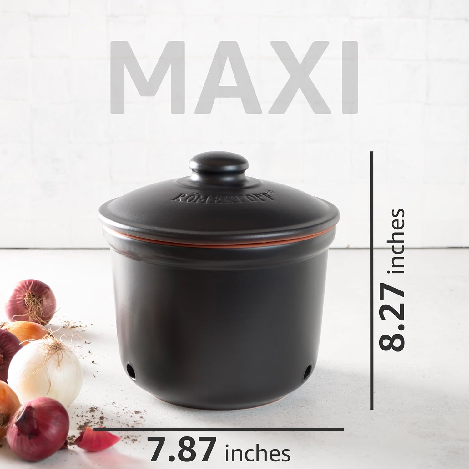 - Includes a Maxi Plus pot for potatoes (5.8 qt), a Maxi pot for onions (2.9 qt), and a Mini pot for garlic (0.6 qt).