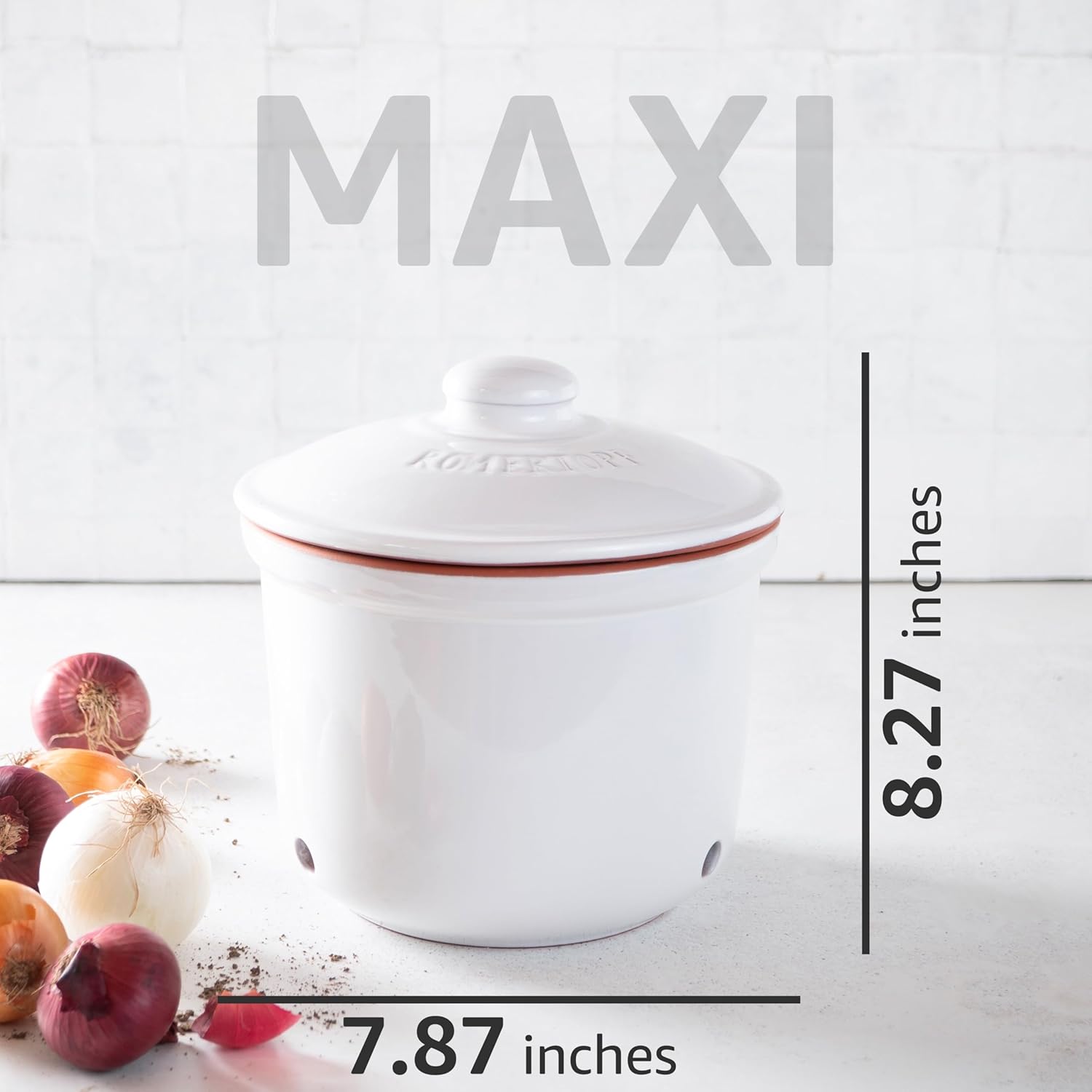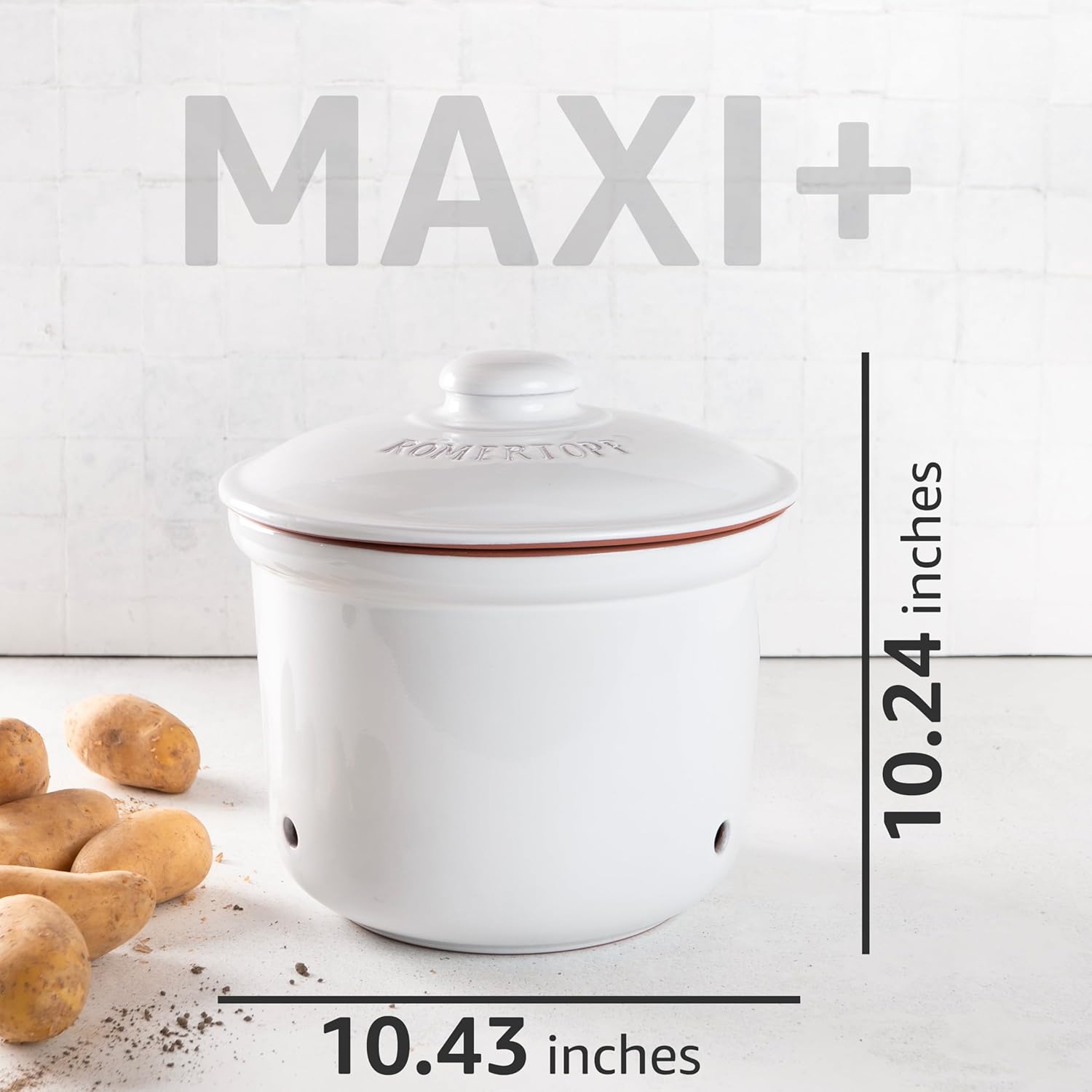 - Includes a Maxi Plus pot for potatoes (5.8 qt), a Maxi pot for onions (2.9 qt), and a Mini pot for garlic (0.6 qt).