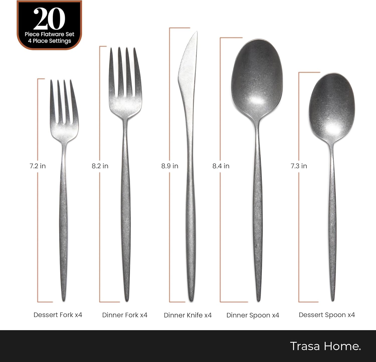 Luxury Vintage Flatware 20-Piece Set – Service for 4, Premium Stainless Steel with Weighted Handles, Aged Heirloom Finish, Dishwasher Safe, Elegant and Modern Cutlery (Vintage Silver)