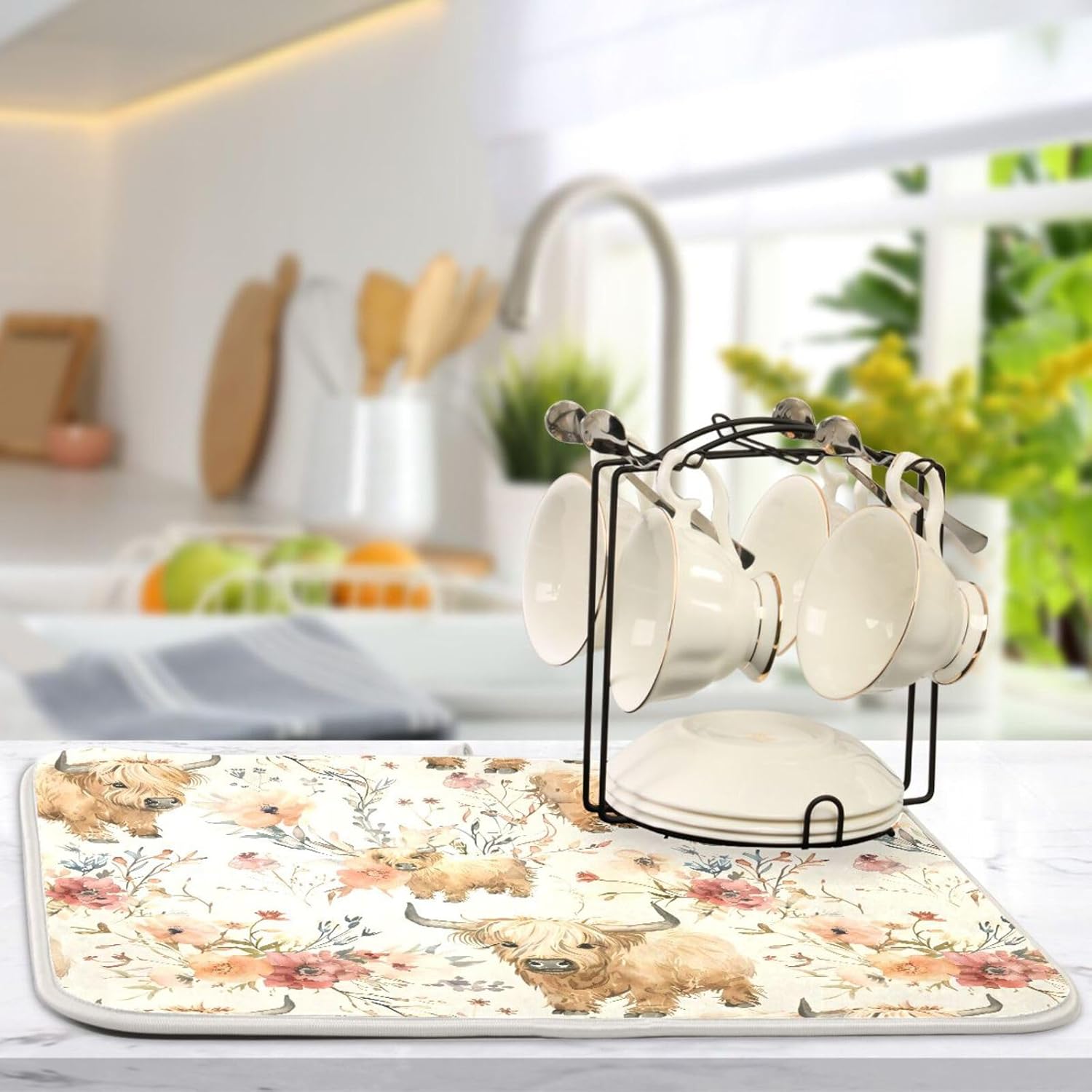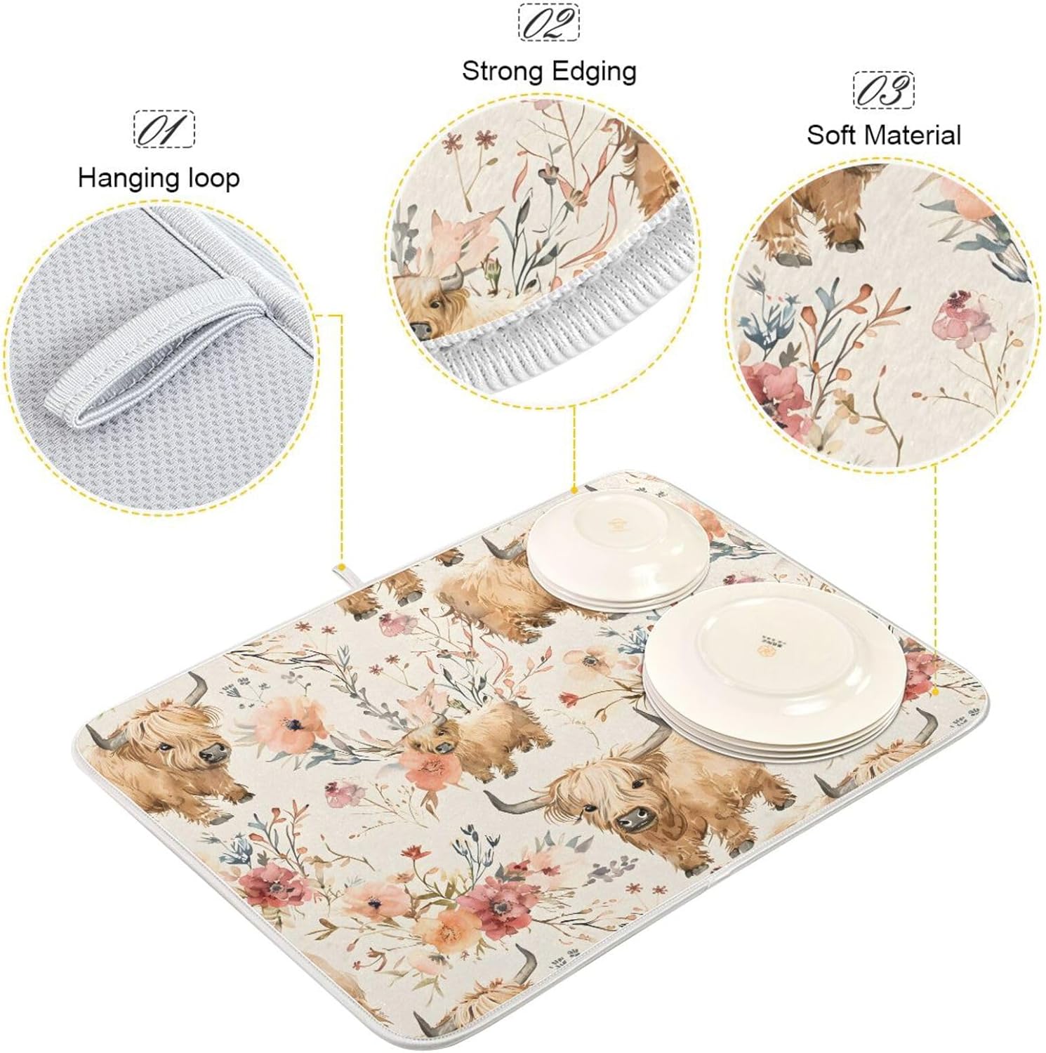 Cute Highland Cows Flowers Dish Drying Mat for Kitchen Counter Absorbent Microfiber Drying Pad, Large 18x24 in, Reversible Drainer Mats