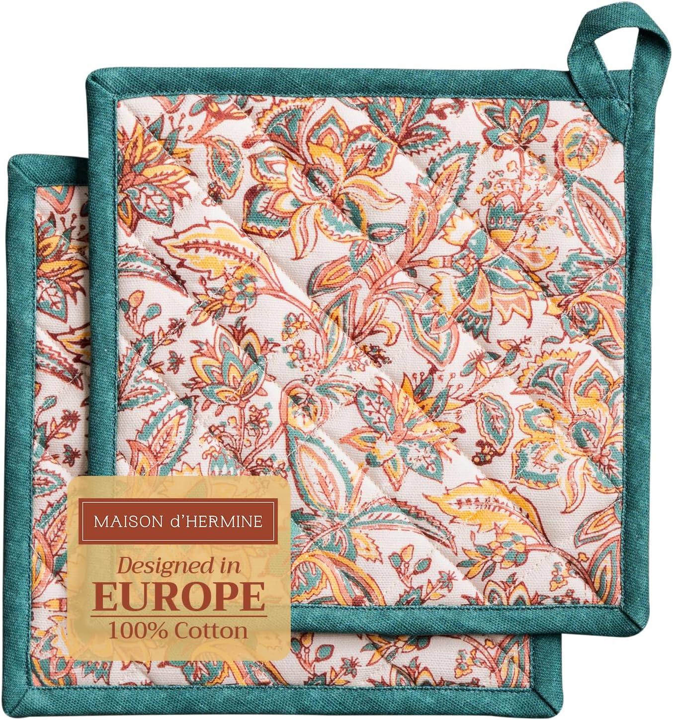 Maison d' Hermine Pot Holders Set 100% Cotton Heat Resistant Potholders 8" x 8" Hot Pads with Loop BBQ, Cooking, Baking, Grilling, Kitchen, Handling Hot Pans (Pack of 2, Nila)
